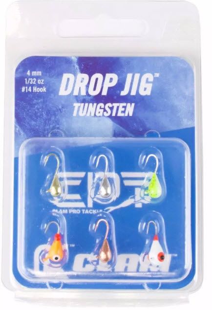 The Clam® 6-piece Drop Jig Kit includes popular colors and jigs made from environmentally friendly tungsten. Offered in two kit sizes - 4 mm, #14, 1/32 oz or 5 mm, #12, 1/16 oz.