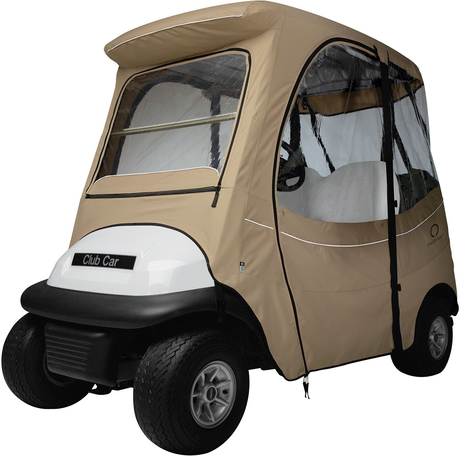 Protect yourself from the elements with the Fairway Precedent Golf Cart Enclosure. Designed to custom fit Club Car® 2 Person Golf Carts, this cover fits over the roof, secures at the bottom, and provides protection from inclement weather. Zippered doors and panels constructed of durable polyester ensure durability and versatility in a variety of conditions. Stay dry when weather strikes with the Classic Accessories® Golf Cart Enclosure.
