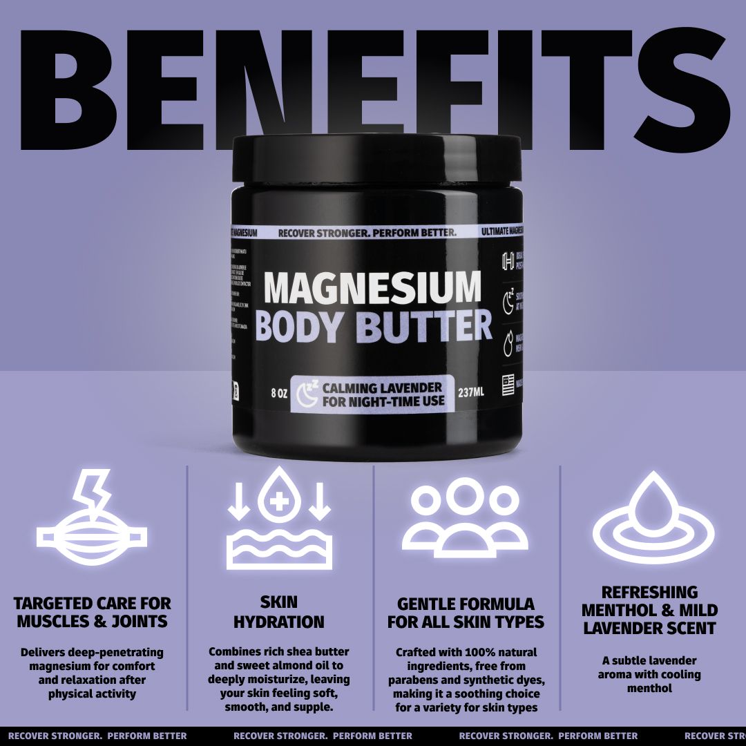 Recover stronger and unwind overnight with Coach Soak Nighttime Magnesium Body Butter, made in the USA with pure Dead Sea magnesium chloride. This thick, nutrient-rich formula absorbs deeply to soothe sore muscles, ease joint pain, and promote restful sleep. Infused with MSM, minerals, vitamins, shea butter, almond oil, and lavender, it hydrates, detoxifies, and boosts circulation. Includes one 8oz jar with a refreshing menthol and calming lavender scent.