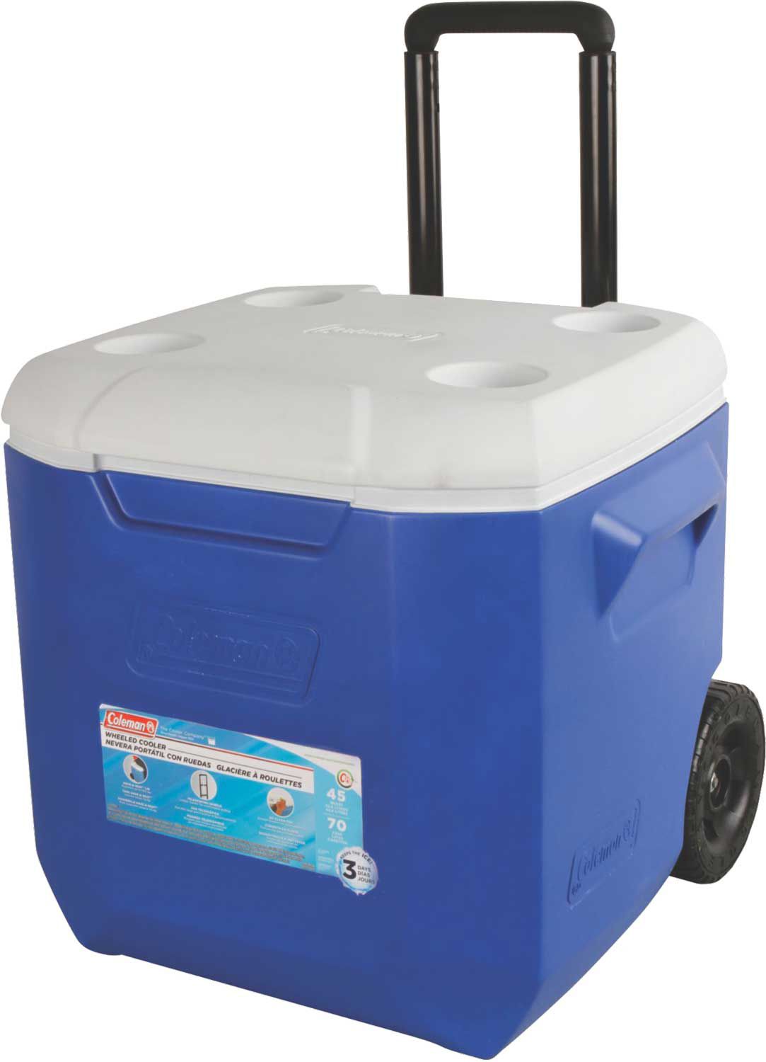 The Coleman® 45 Quart Rolling Cooler locks in the cold, allowing you to enjoy a cold beverage all day long. Its large wheels and retractable handle makes transporting the cooler super easy and convenient, forget carrying a heavy cooler again. Even on hot summer days, this cooler will keep your supplies cold and fresh with its ThermOZONE™ insulation. The Coleman® 45 Quart Rolling Cooler will be your new favorite cooler.