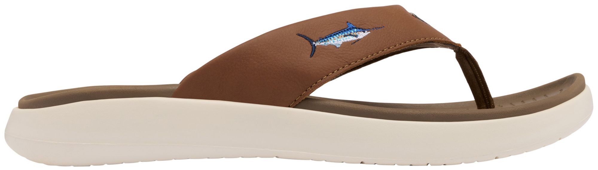 Full grain leather and foam strap with soft density foam footbed for premium comfort. Embroidered fish detail