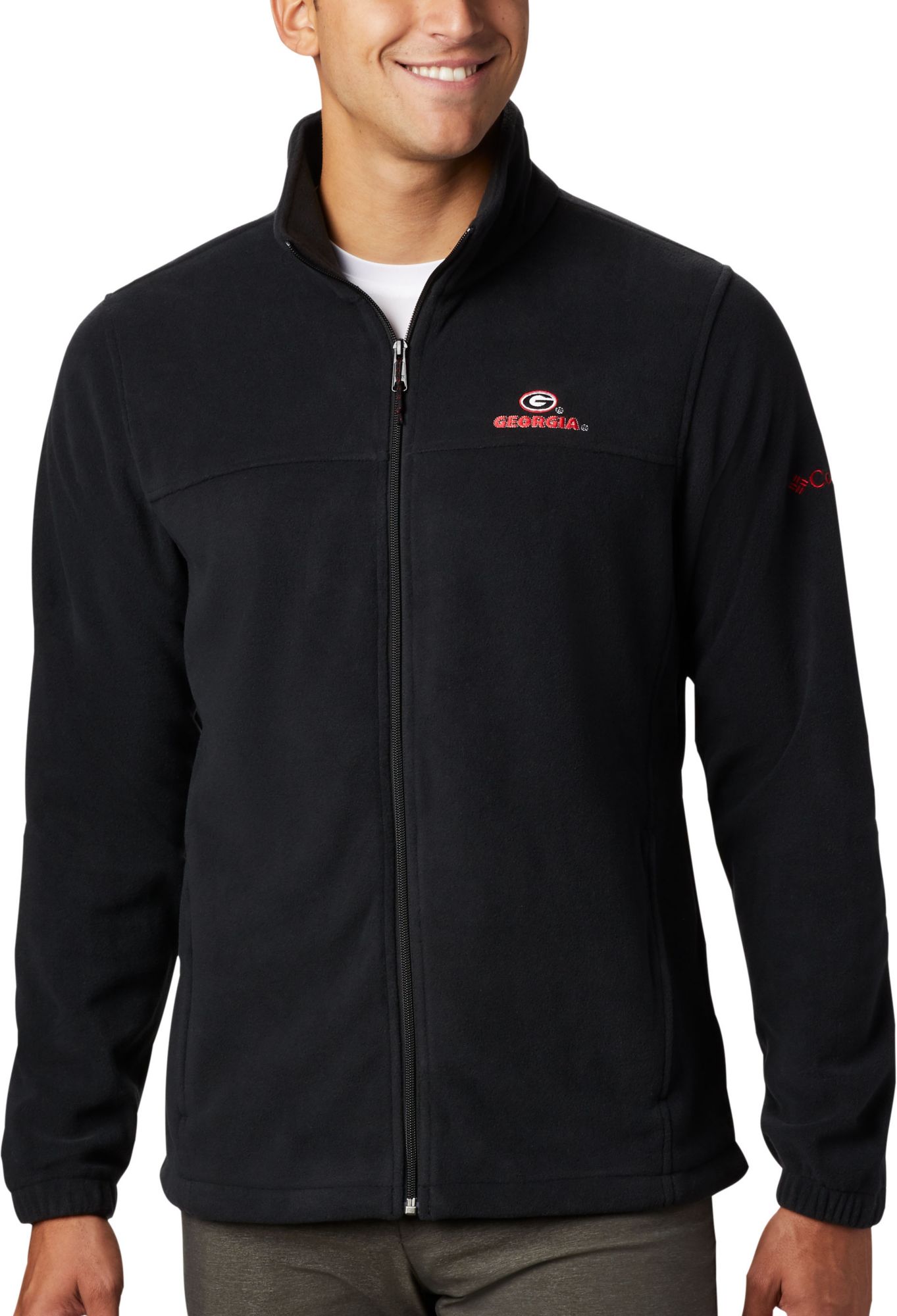Shut down the cold with Georgia pride on game day with the Columbia® Men’s Georgia Bulldogs Flanker Full-Zip Fleece Jacket