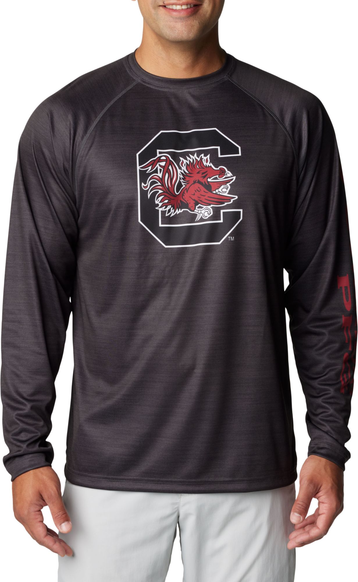 This long sleeve tee provides warmth if needed or wicking if needed. The Gamecock block C logo and lettering on the sleeve are screen printed directly onto the shirt which gives it the quality I was looking for, not plastic lettering that would peel off. This Columbia shirt does not disappoint!