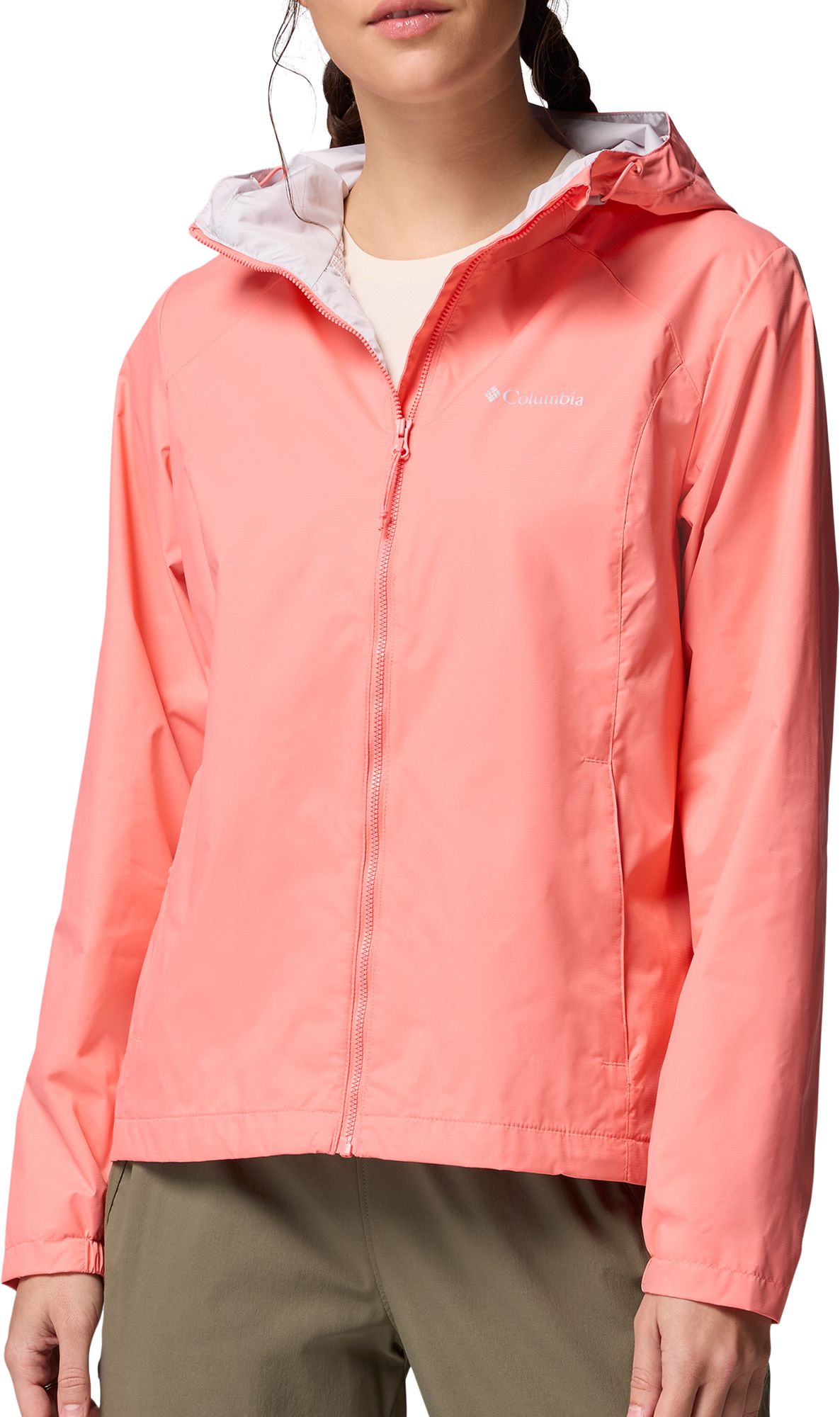 I bought this jacket about a month ago and have worn it several times in light to medium rain. It is very comfortable and true to size. I am usually women’s size 8 and bought a medium. It is very light weight and breathable and I love the hood has a drawcord so it doesn’t blow off during a windy rainstorm.