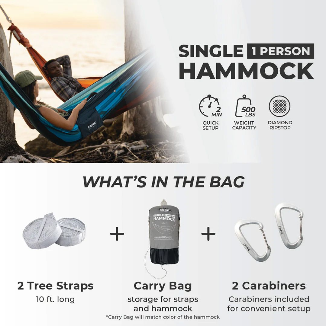 The CORE™ Hammocks are ready to elevate your camping experience, constructed of premium quality diamond ripstop nylon and includes everything you need to hang your hammock. Never worry about losing your personal belongings with convenient gear pockets. And when it’s time to pack up and move on, the included carry bag has separate compartments for your suspension and the hammock.