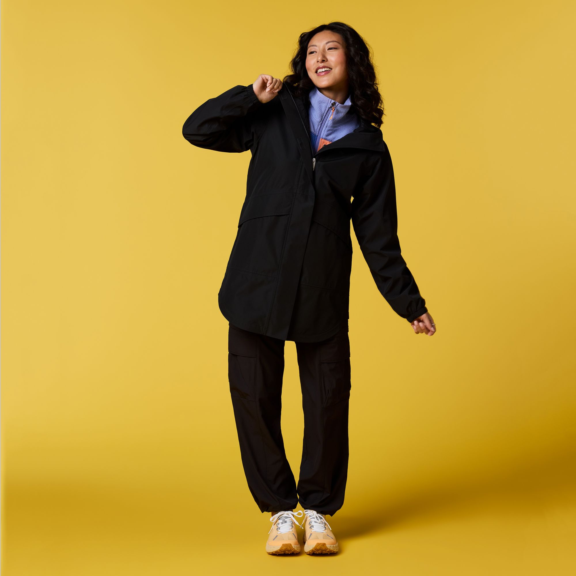 Fully waterproof and breathable extended-length rain shell made with recycled polyester and a mesh lining. Perfect for strolling city streets and repelling spring showers.