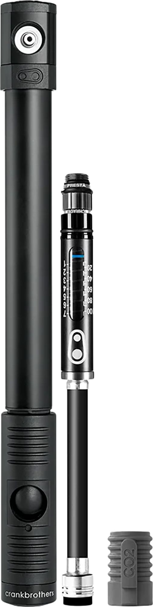 - Features also include a concealed co2 inflator (presta only), air pressure gauge, magnetic head with twisting collar, a folding and locking handle, and a presta/schrader valve adapter (fully threaded presta valve bodies only)