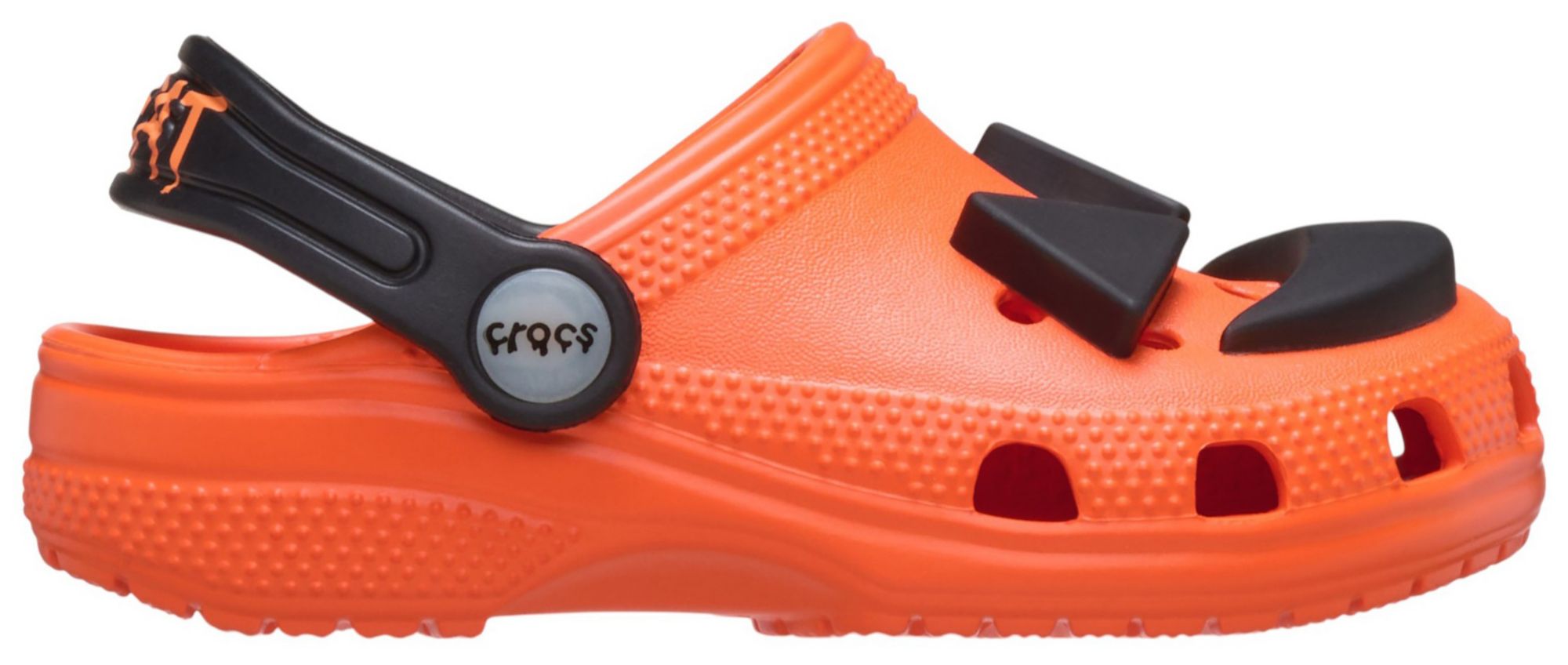 Trick or treat! This version of the iconic clog features a fun Jack O’ Lantern face that lights up with every step. Plus, ‘Trick’ is printed on the left heel strap and ‘Treat’ is printed on the right heel strap. Kids will enjoy the fun Halloween theme, and Croslite™ foam construction keeps the clogs comfortable and easy to wear. Crocs offers a variety of Classic Clogs for Kids and Toddlers that feature inspired designs to help kids express themselves and engage new friends, resulting in more fun.