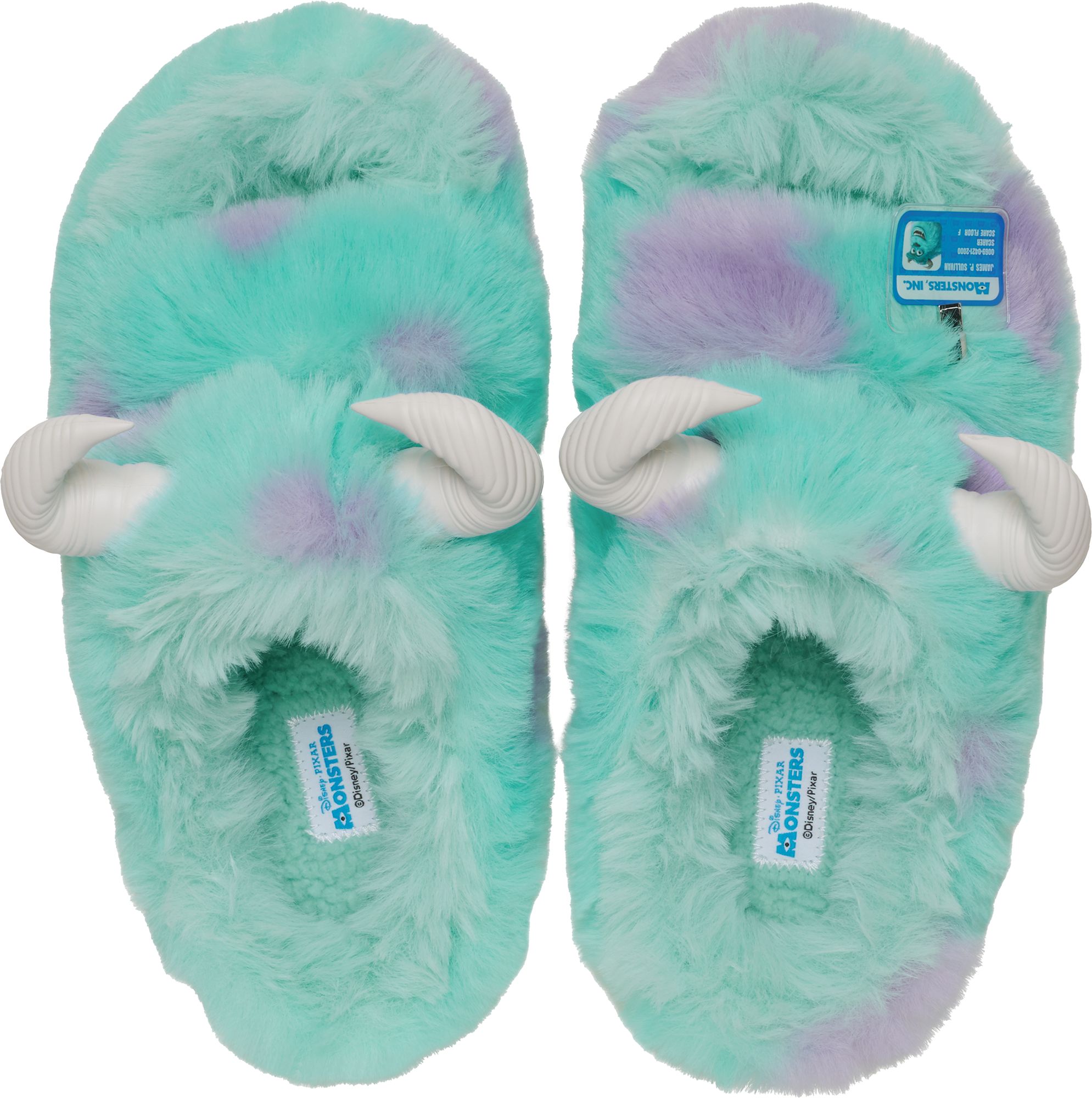 Narrative The legendary James P. Sullivan, aka Sulley, has arrived as an ultra-soft Cozzzy Sandal from our Disney and Pixar Monsters, Inc. collection. This fuzzy silhouette is covered in Sulley’s blue fur with purple spots and topped with soft horns for a sandal style that is frighteningly comfortable. Sulley’s Monsters, Inc. nametag is fixed on the upper strap as a decorative charm so they never forget the name of Monstropolis’s top scarer.