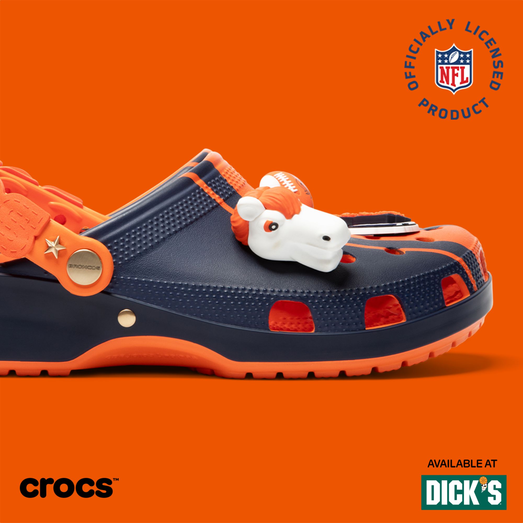 Why are sunsets in Colorado always blue and orange? Because everyone is a Broncos fan. Let us bless your game day outfits with the unofficial official footwear of Broncos Country: the Denver Broncos Classic Clog. Will they be lucky enough to help your team make it all the way this year? Only one way to find out. Saddle up!