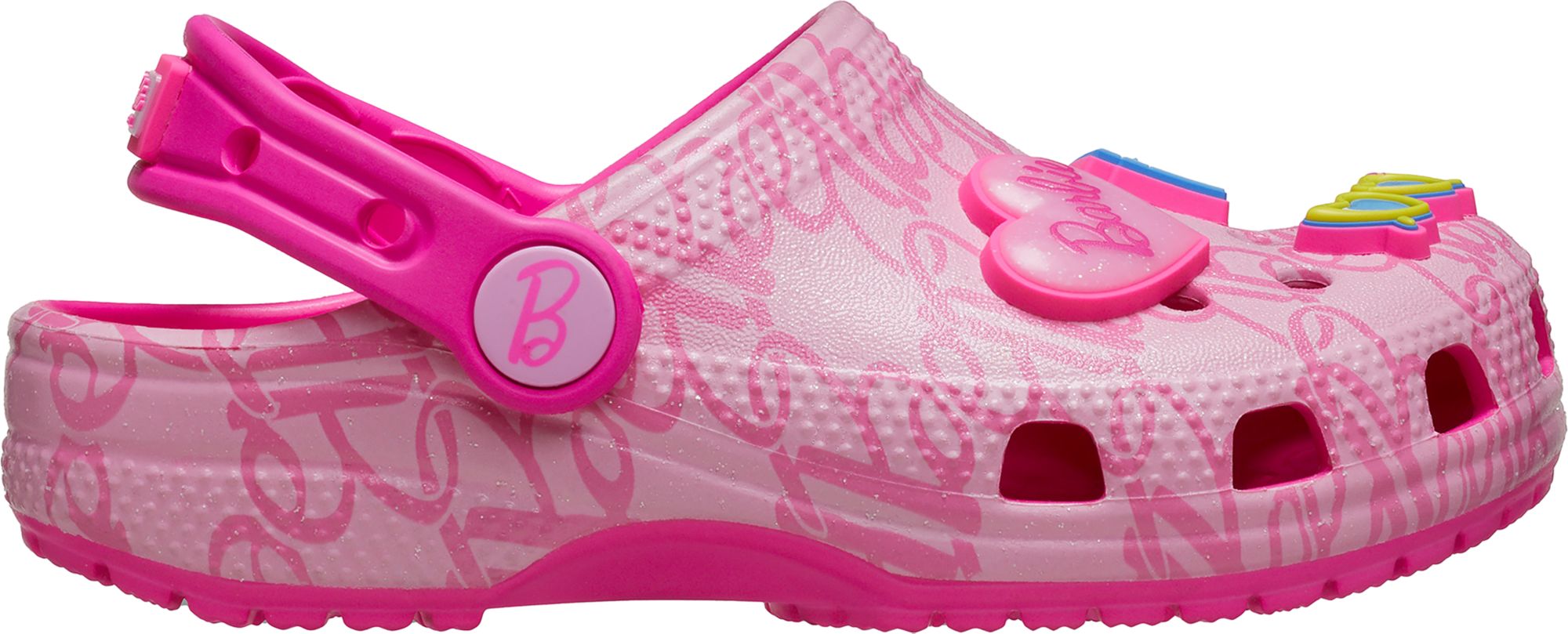 The new Barbie™ Classic Clog is the perfect statement shoe for fashion icons everywhere. This comfortably chic style comes in a pink hue with a stylish all-over monogram print. Make your look shine with elevated enamel Jibbitz™ charms featuring a Dreamhouse™, roller skate, palm tree, heart sunglasses, and Barbie™ logo.