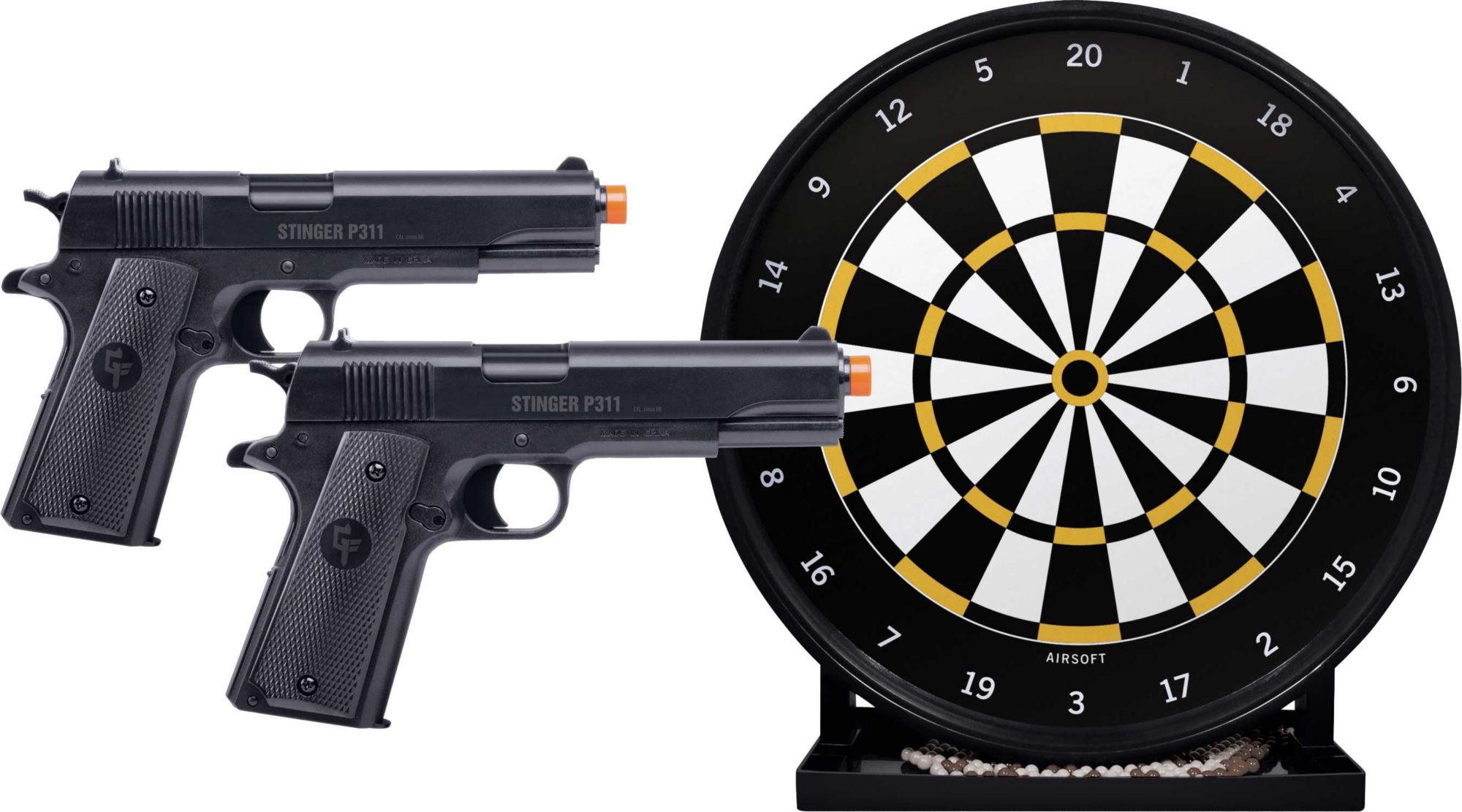 The Stinger Challenge Airsoft Kit gives you everything you need for fun and competitive airsoft target shooting. This kit includes two PS311 repeater airsoft pistols that hold 12 BBs and shoot at velocities up to 275 fps. In addition, it features a Gel-Trap target equipped with scoring rings and a convenient tray that catches BBs. The Crosman® Stinger Challenge Airsoft Kit has two packages of 500 count .12g airsoft BBs.