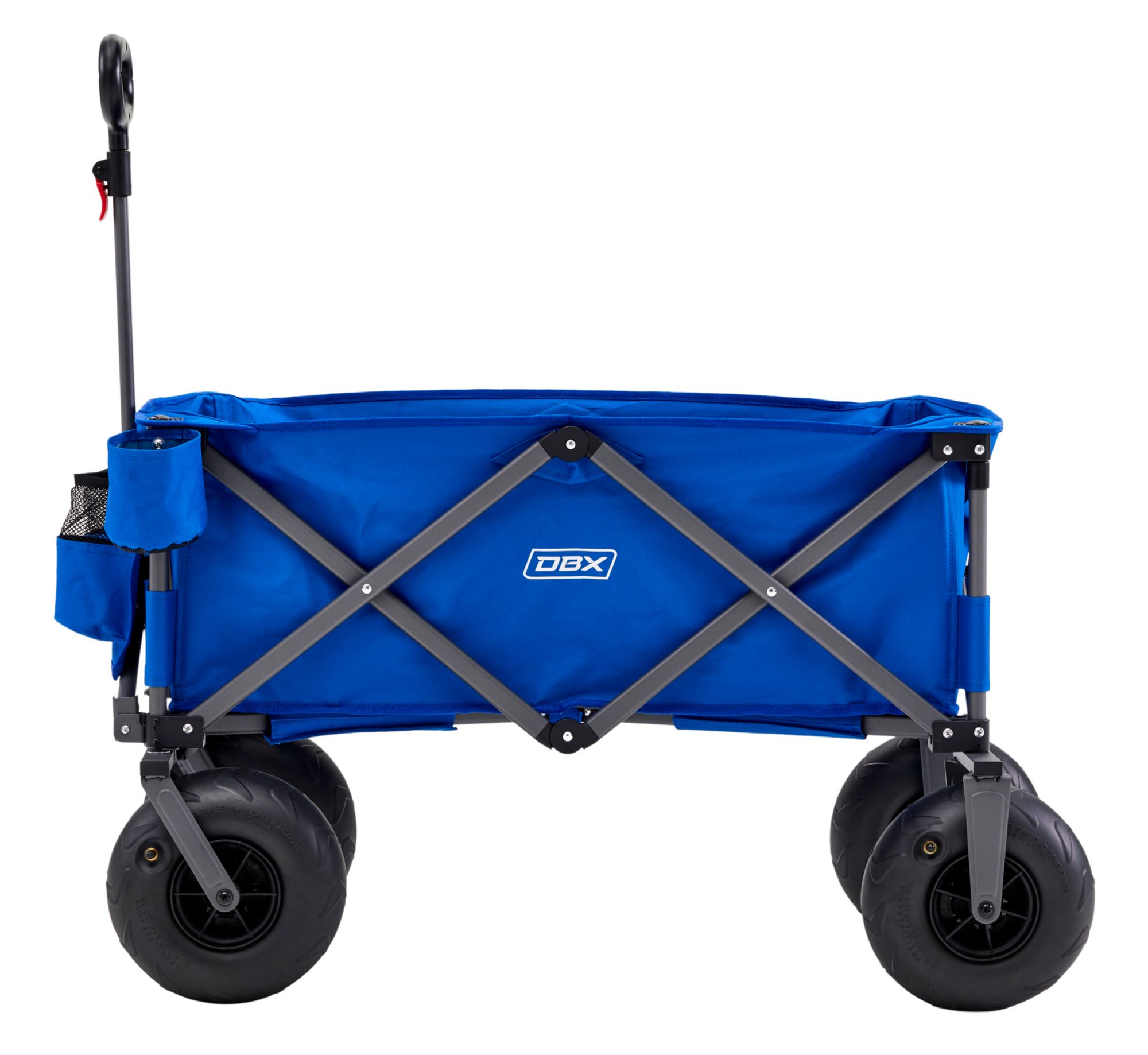 The large wheels are great on all surfaces. The handle does not retract all the way down when not in use.