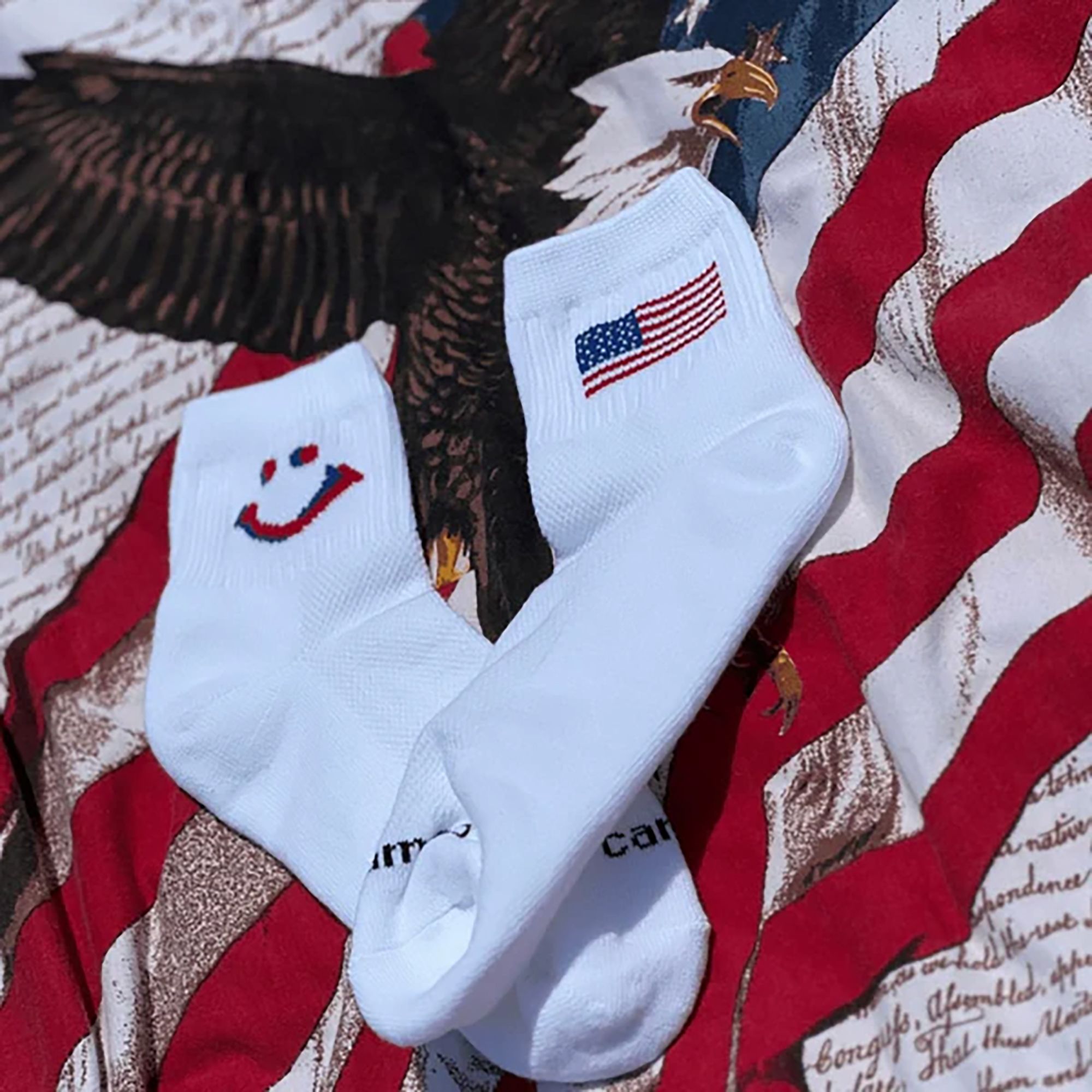 Features an American Flag and a red and blue smiley