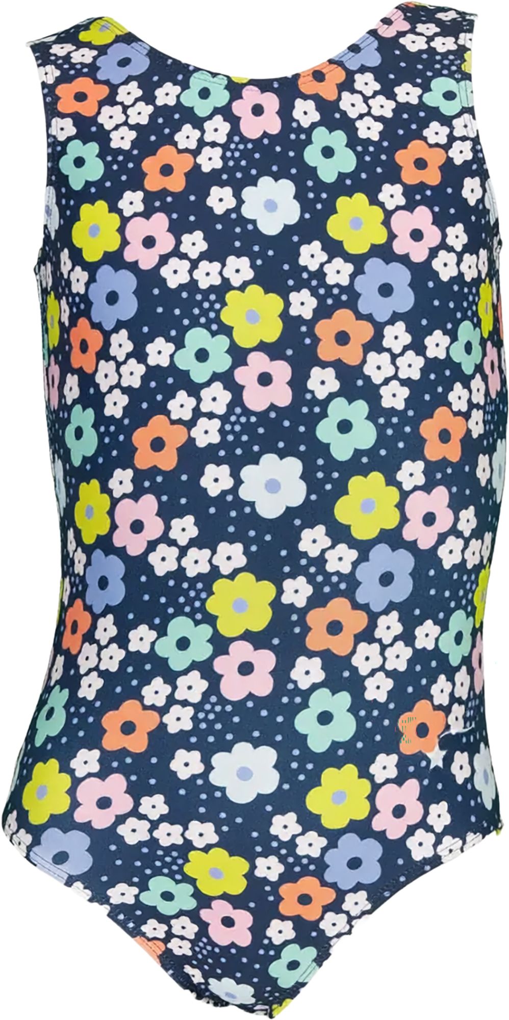 Spring into the gym in May Flowers - a buttery soft, sleeveless leotard for gymnasts. This blue leotard features showers of colorful flowers across the front and back.