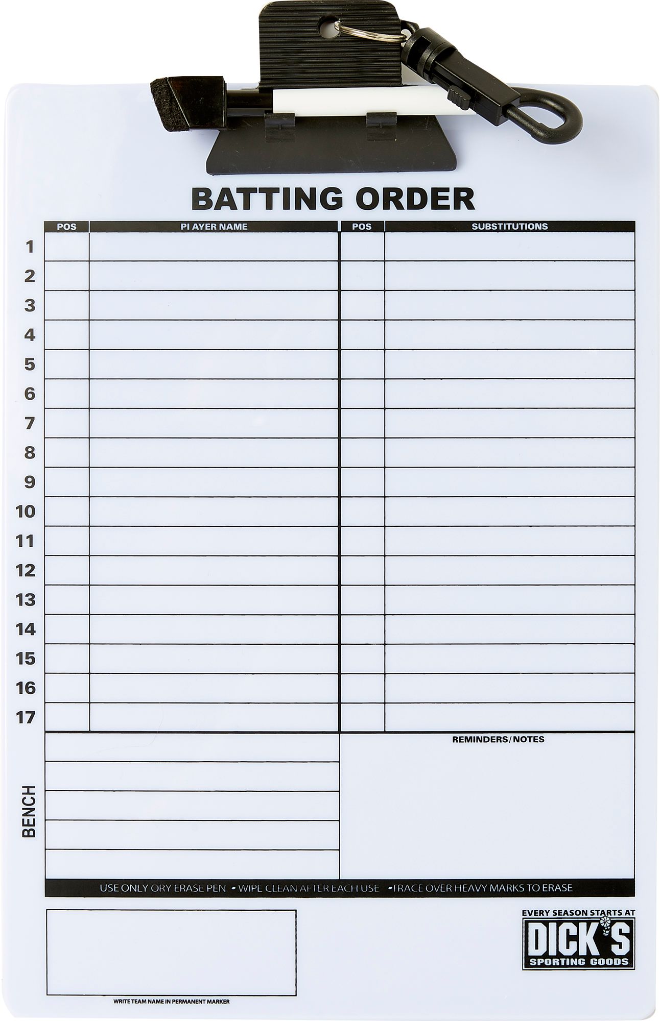 Batting order space for 17 players, 17 substitutes, bench players and notes Durable vinyl protector stops smudges Dry erase pen with built in eraser lets you make changes on the fly