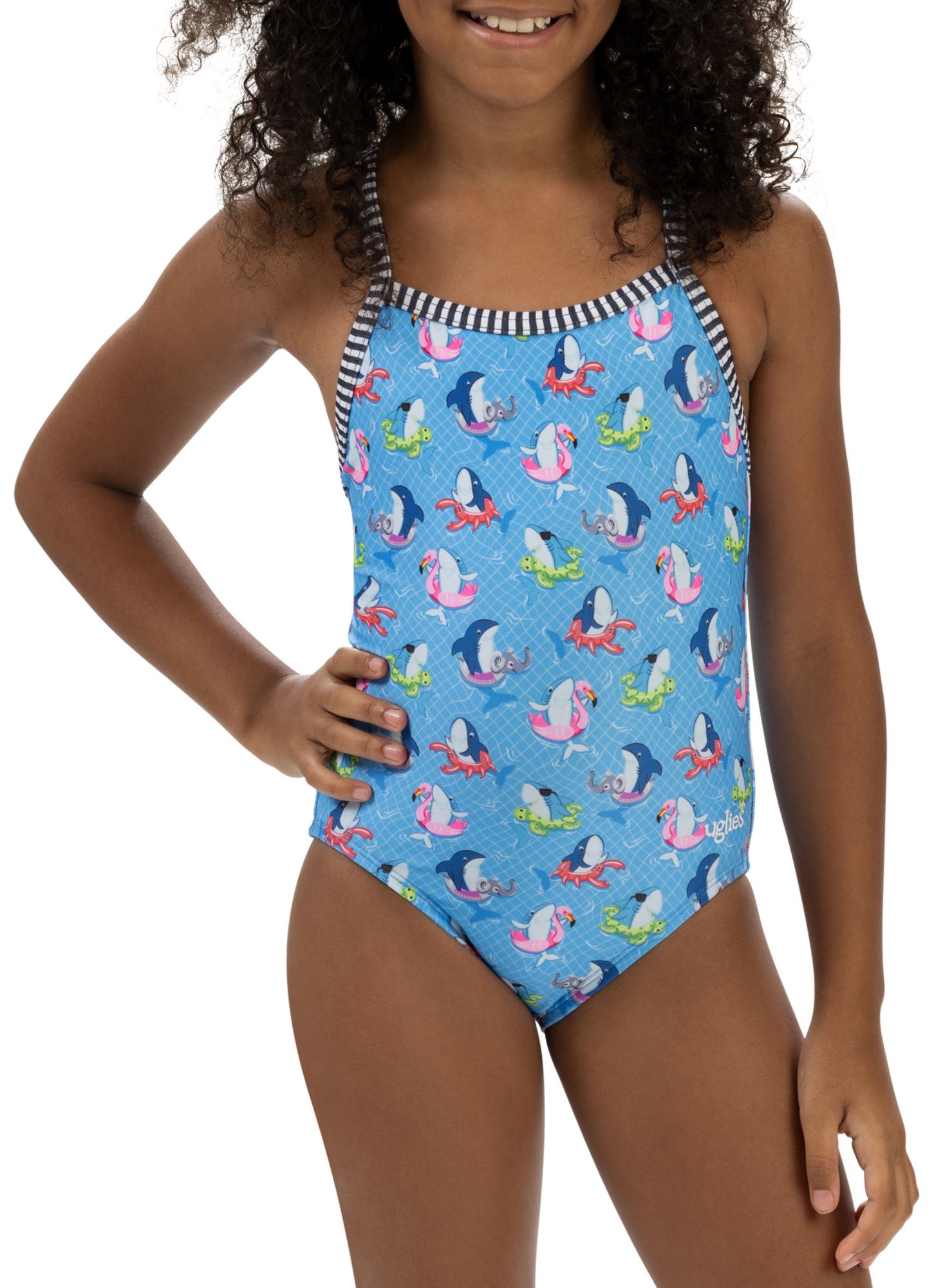 Get ready to make a splash with the Uglies Girls' Fin Floats Criss-Cross Back One Piece, featuring a playful design of sharks lounging on colorful pool floats! This suit is perfect for little ones who love to ride the waves of fun while looking fabulously fierce. With its criss-cross back providing extra support and style, your swim superstar will feel confident and comfortable taking on every cannonball competition.