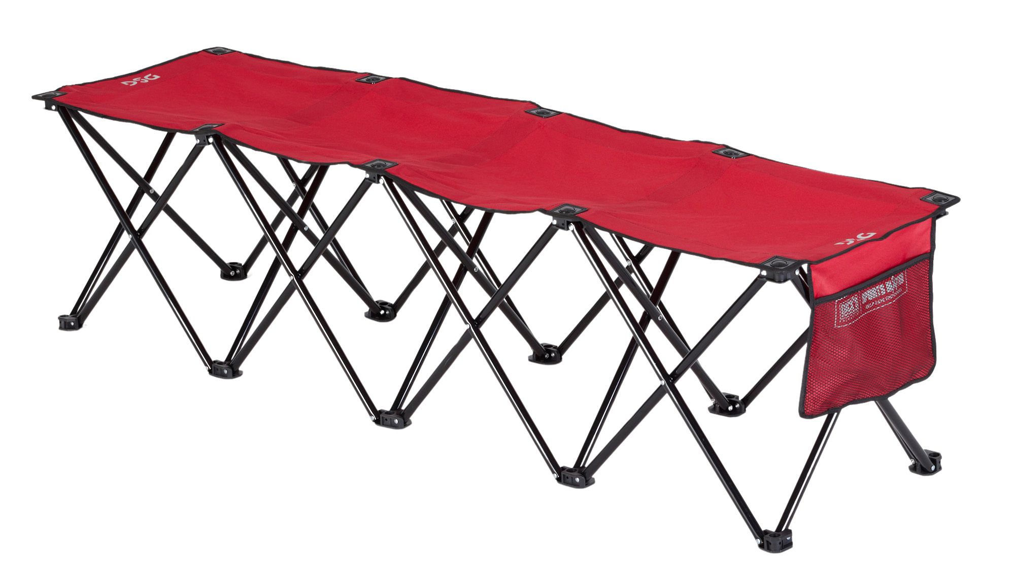 Have instant group seating at games and outdoor gatherings with the DSG Sidelines Bench. The Sidelines Bench fits 4 people comfortably and is constructed with a durable steel frame and strong polyester fabric that will last many seasons and camping trips. The bench takes seconds to open and close, and features a mesh storage bag on the end. A carry bag is included with straps for convenient transportation.