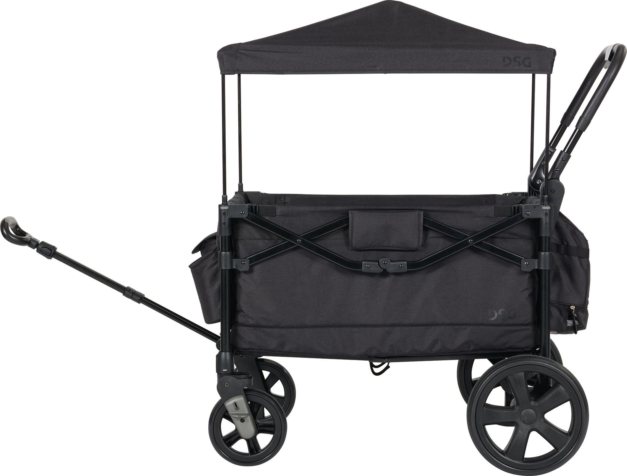 Introducing the DSG Stroller Wagon, designed for children aged 2-7. This versatile wagon features two 5-point safety harnesses, front and rear storage pockets, and a removable UPF 50+ canopy for sun protection. With an impressive weight limit of 110 lbs., it includes brakes and an anti-shock system for a smooth ride. The adjustable push handle and telescoping pull handle ensure comfort and easy steering. When not in use, it conveniently folds for storage and transport. Crafted from a durable steel frame and water-resistant 300D polyester fabric, the removable fabric is hand washable. Perfect for adventurous outings with your little ones!