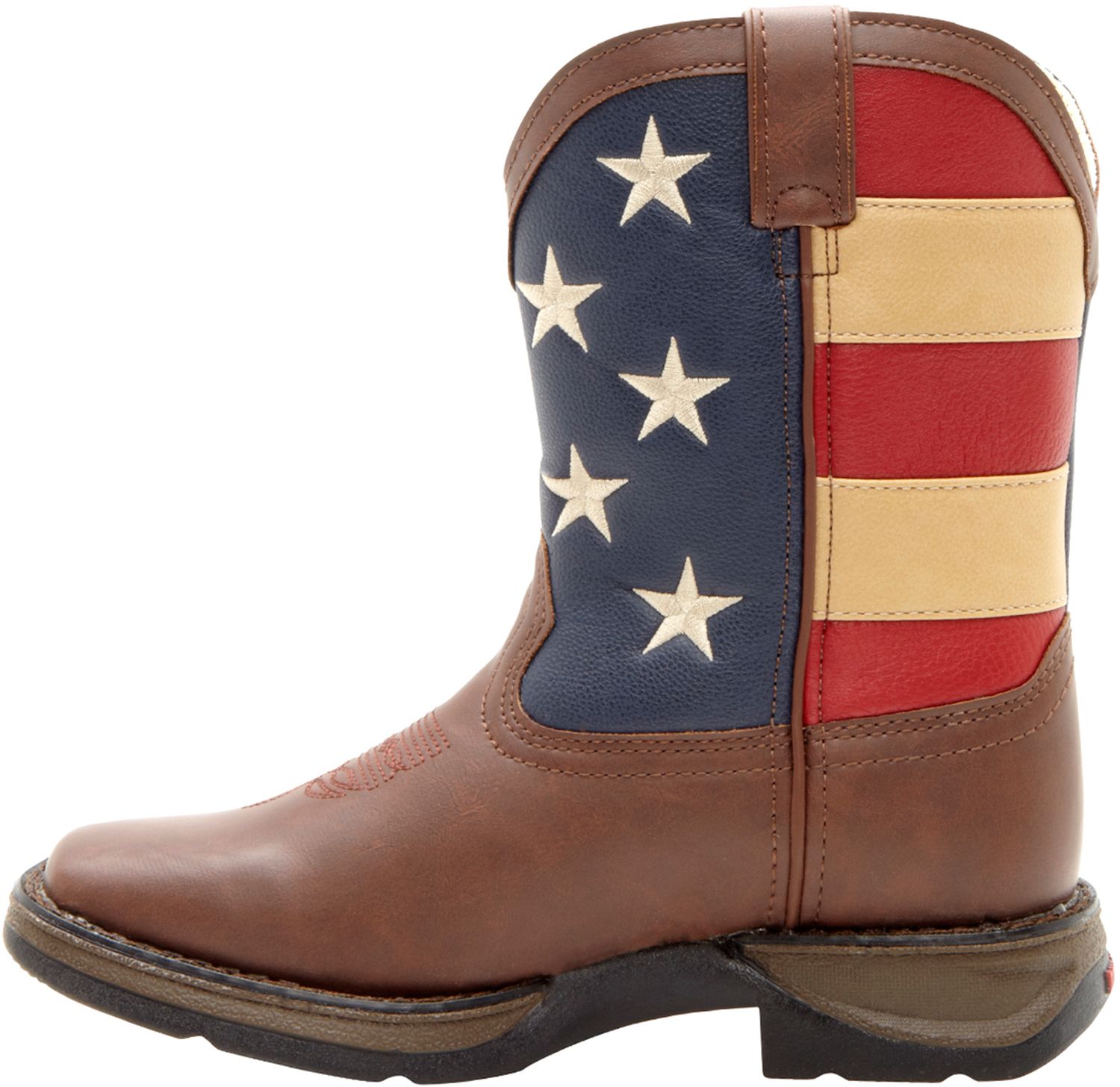 Show your child’s American pride with the Durango® Kids’ Patriotic Western Boots. The square toe and rocker heel offer classic style. A rubber unit outsole provides traction while the cushion flex insole keeps your kid’s feet comfortable and pain-free. Double row welt stitching reinforces boot material to prevent fabric degradation. The boots’ tempered steel shanks support your little one’s arches.