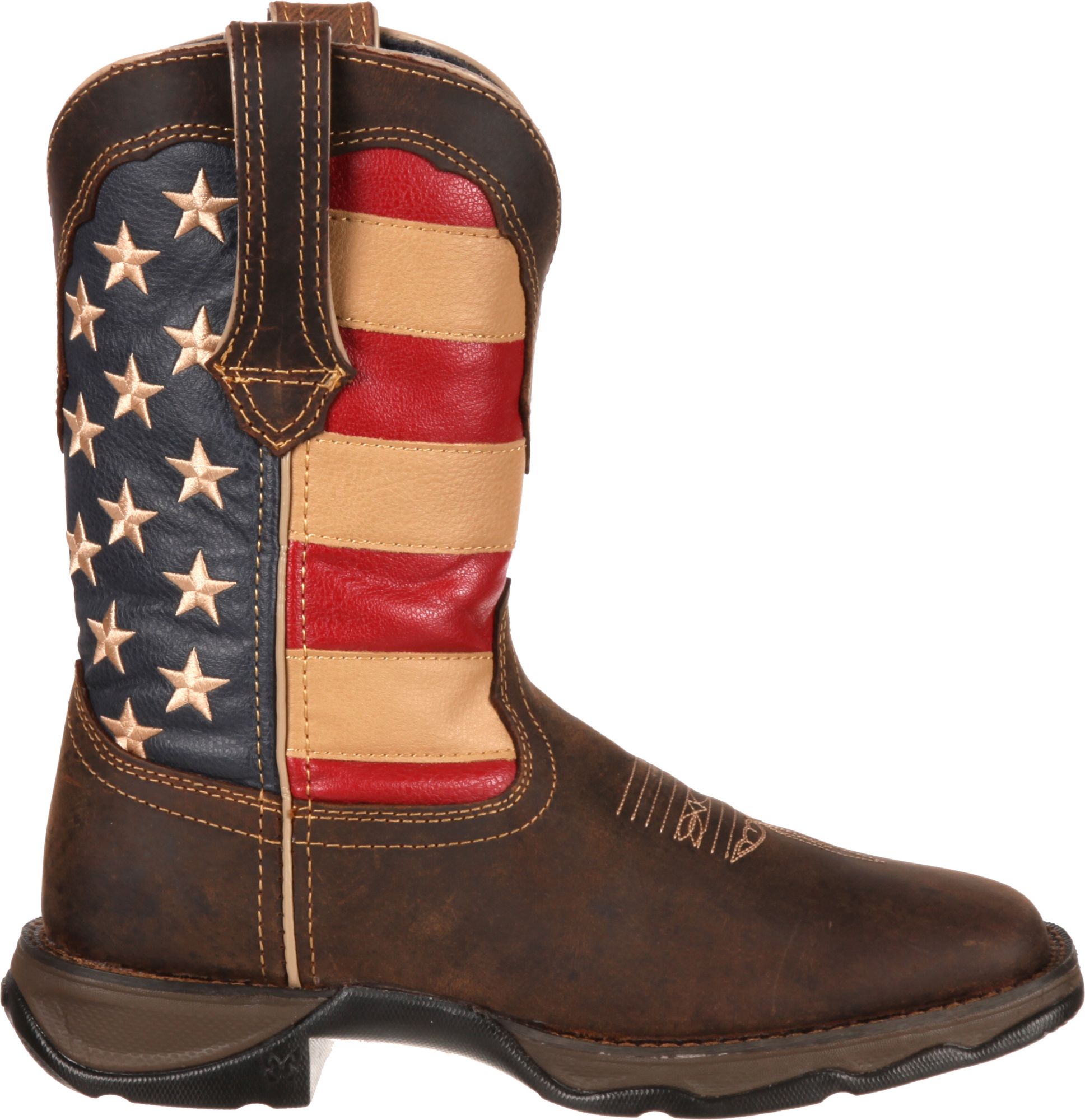 Display your national pride with the Durango® Women’s Rebel Patriotic Pull-On Western Boots. The distressed leather shaft features a flag print, and double row stitching adds even more style. A removable Cushion Flex insole boosts comfort for all-day wear while the tempered steel shank provides stability. With a rubber outsole for increased traction, you’ll step with confidence and turn heads in the Durango Rebel Patriotic Western Boots.