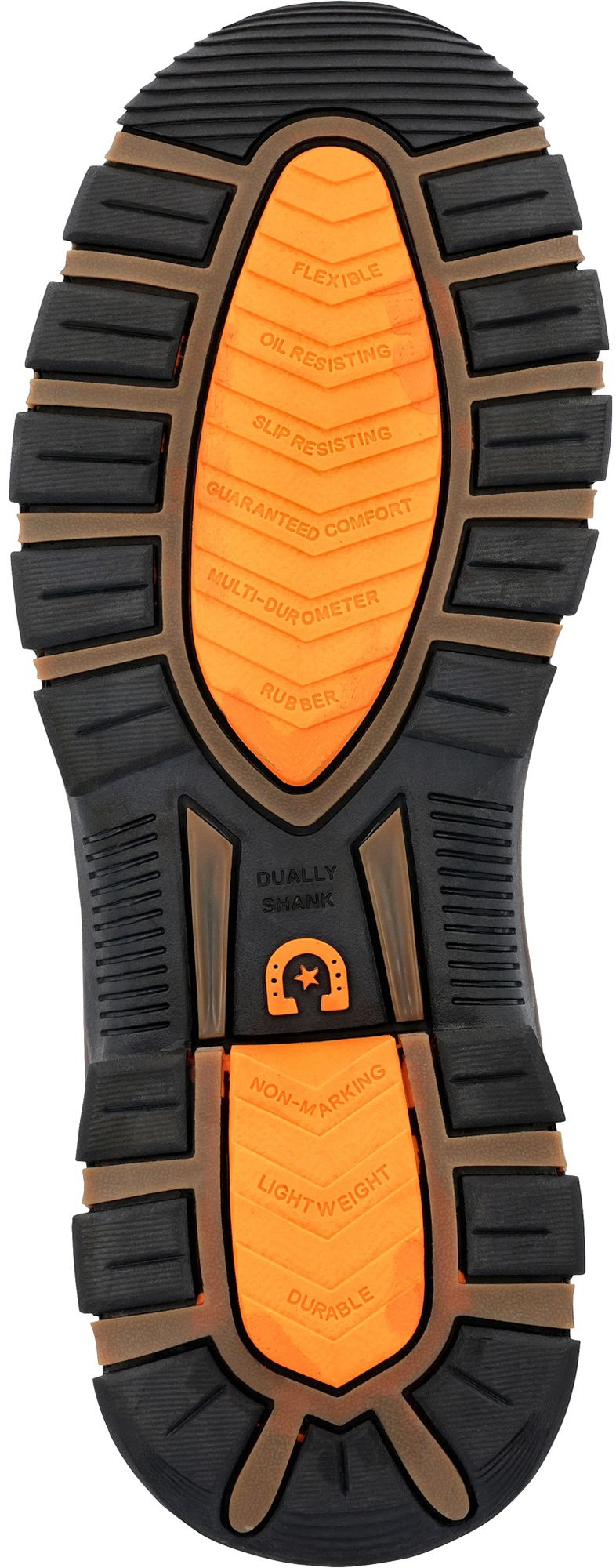 Slip, oil and heat-resistant multi-durometer rubber outsole for surefooted traction