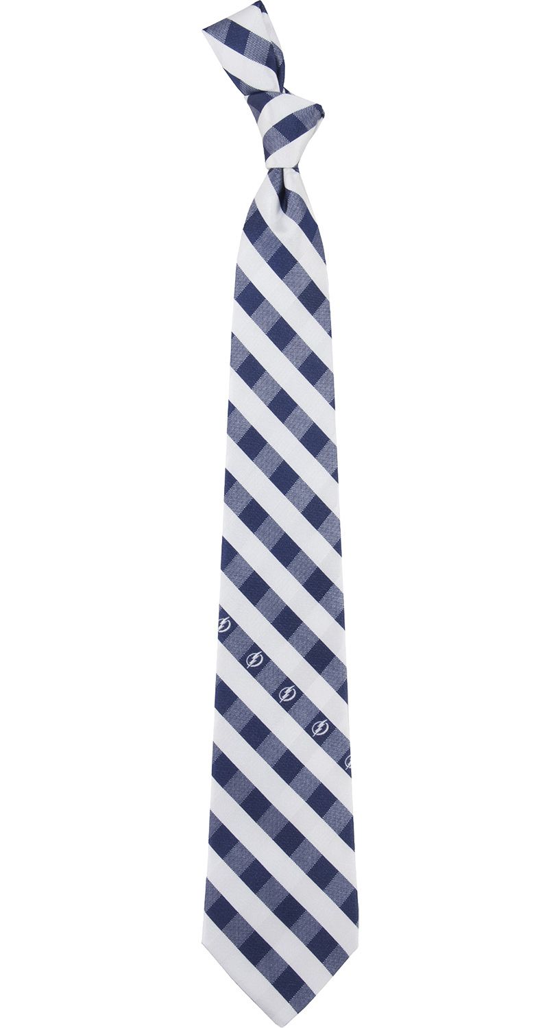 Send out your checking line this season with the Eagles Wings® Tampa Bay Lightning Check Necktie. The contrasting, team-color stripes complete a stylish design to keep you in high fashion for every boardroom meeting and rival beating. A polyester base offers a comfortable, durable feel while the detailed lower stripe logos complete your team allegiance. Hop the boards next game with the Tampa Bay Lightning Check Necktie.