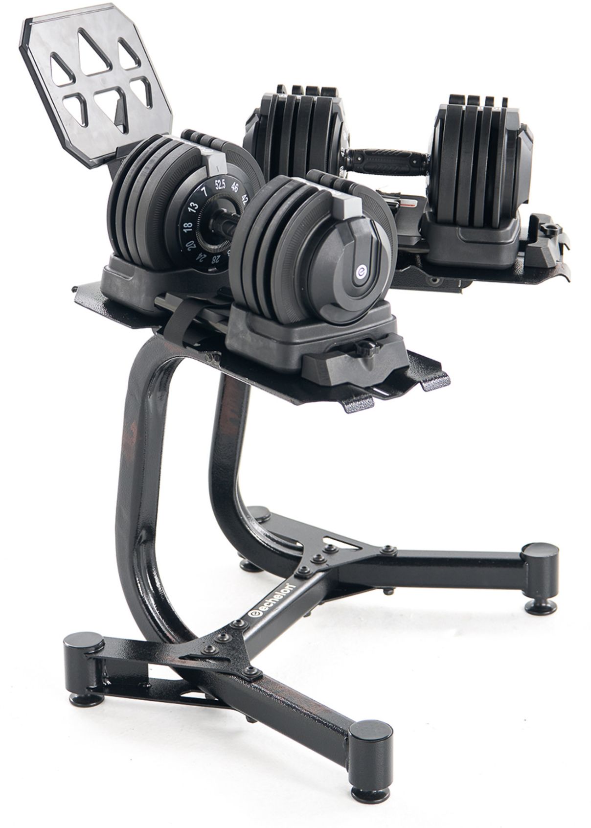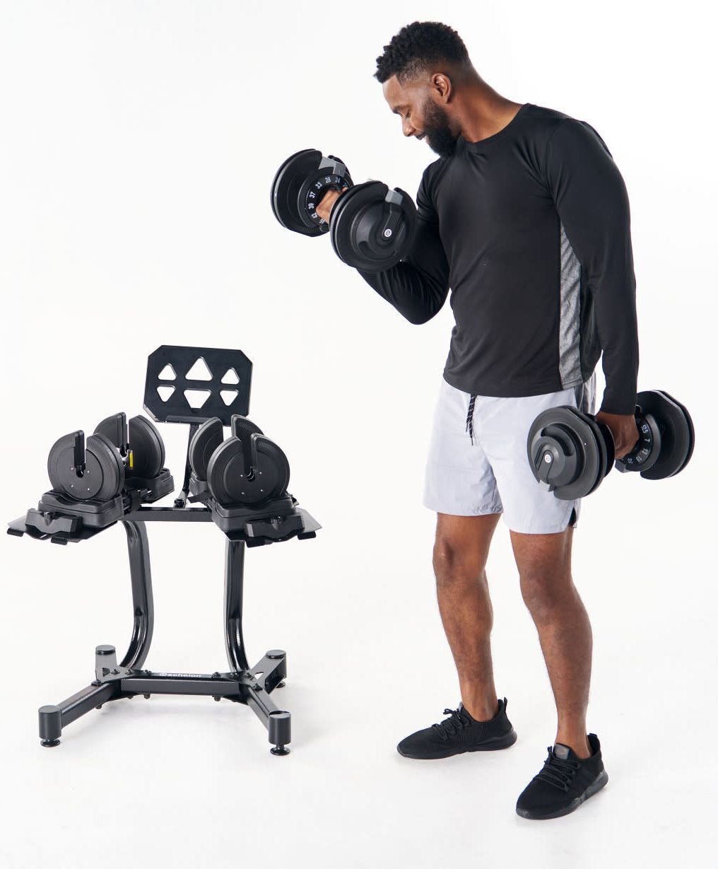 Elevate your strength training at home with the Echelon Strength Adjustable Dumbbells 752 with Stand, designed to replace multiple sets of traditional dumbbells in one compact solution. Offering a weight range from 7 to 52.5 lbs, this multi-weight dumbbell set adapts to your progress, making it perfect for full-body workouts, from toning arms and shoulders to building strength in legs, back, and chest.