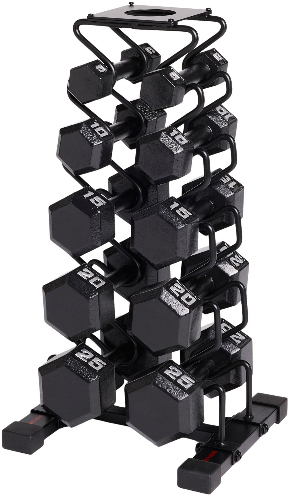 The ETHOS Dumbbell Kit + A-Frame Rack delivers everything you need to start building strength at home. With five pairs of cast iron dumbbells (5–25 lbs.) and a space-saving wire storage rack, this complete set keeps your workouts efficient and your space organized. Whether you're training upper body, lower body, or full-body circuits, this kit is built to perform and designed to fit your routine.