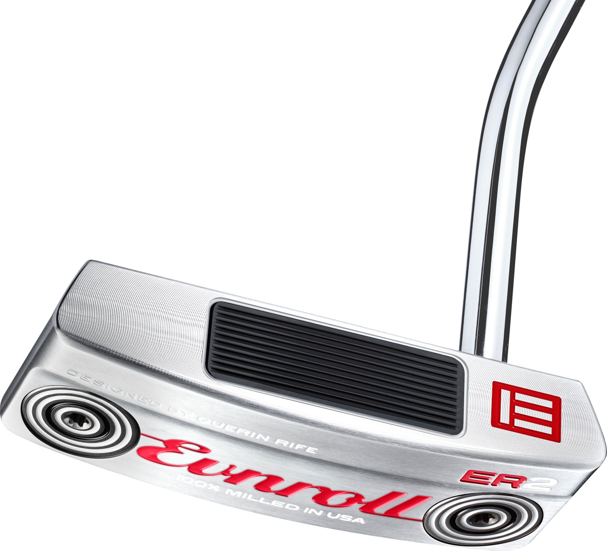 By far the most popular head shape in the Evnroll Neo Classic lineup. The single-bend shaft mounts directly in the head creating a slight toe hang. It is ½” shorter from heel to toe but deeper from front to rear than the ER1.2. The result is the look and feel of a blade with a longer sightline for both perpendicular and parallel alignment. A unique feature to Guerin Rife putter designs, the top line is thinner behind the ball and over the cavity giving the ER2 a more elegant presentation at address.