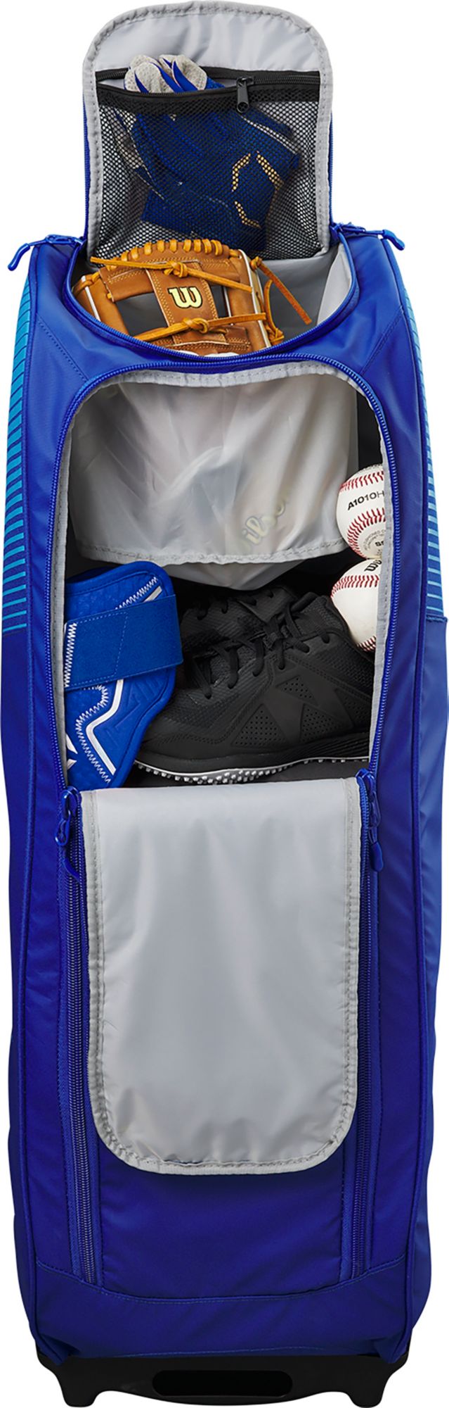 Keep your equipment under control with the EvoShield Tone Set Wheeled Bag, a roller bag with all the space required for equipment you need at practices or games. This bag features a high rise wheel chassis with rugged molded wheels, making it easy to traverse any terrain with a bag filled with heavy gear. Store all gameday essentials in the expansive main compartment, then keep accessories or a fielding glove in the large valuables pocket. Complete with a zippered bat compartment, this water-resistant bag easily caries four bats. Hang the bag up in your dugout with the integrated fence hook, then access all the tools you need on game day.