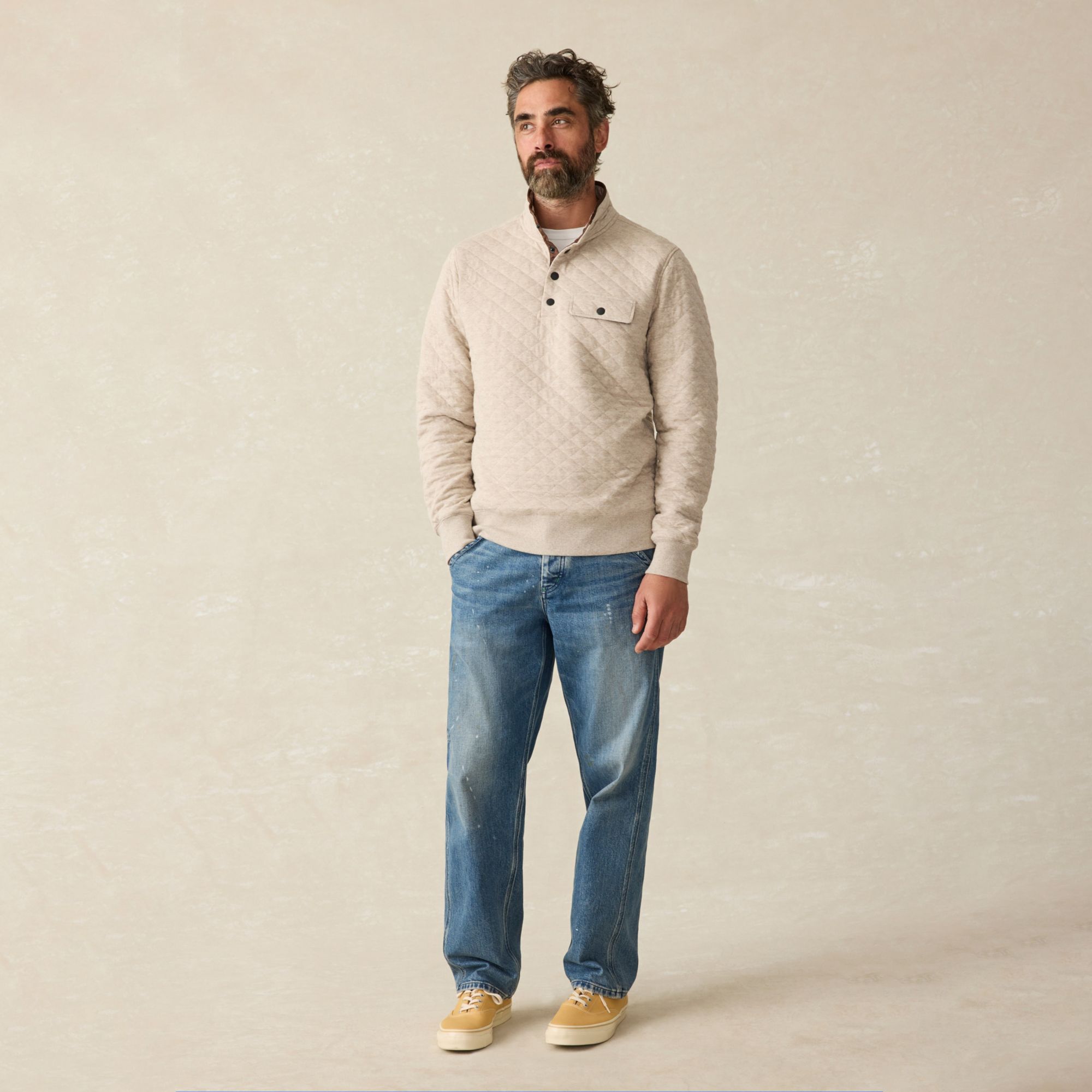 This material looks great and can be dressed up or down, especially the cream color. It’s loose enough that you can wear a longsleeve under when it gets really cold