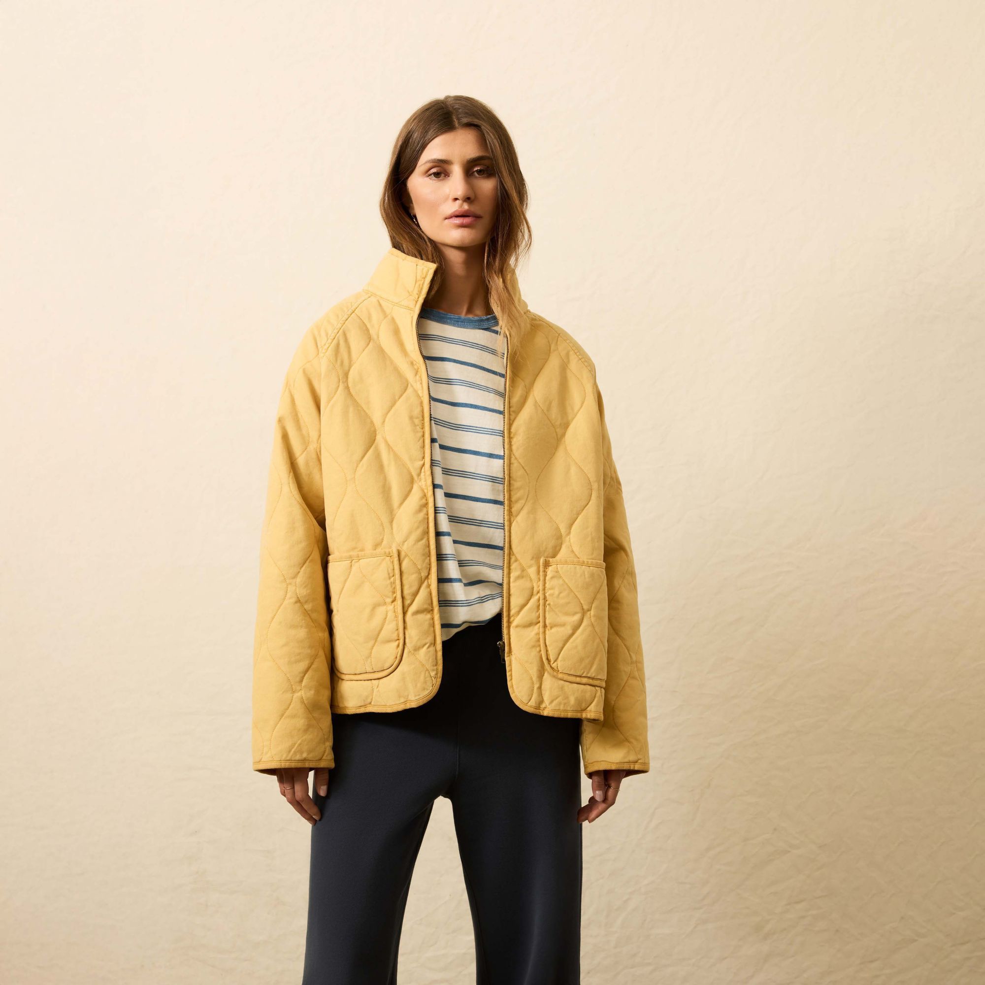 Lightweight yet substantial, this quilted cotton jacket is designed to bring ease and polish to cooler days. The soft, garment-washed cotton feels broken-in from the start, while the clean lines and minimal detailing give it a timeless appeal. Layer it over knits or under a heavier coat-it’s a versatile piece you’ll reach for year after year.