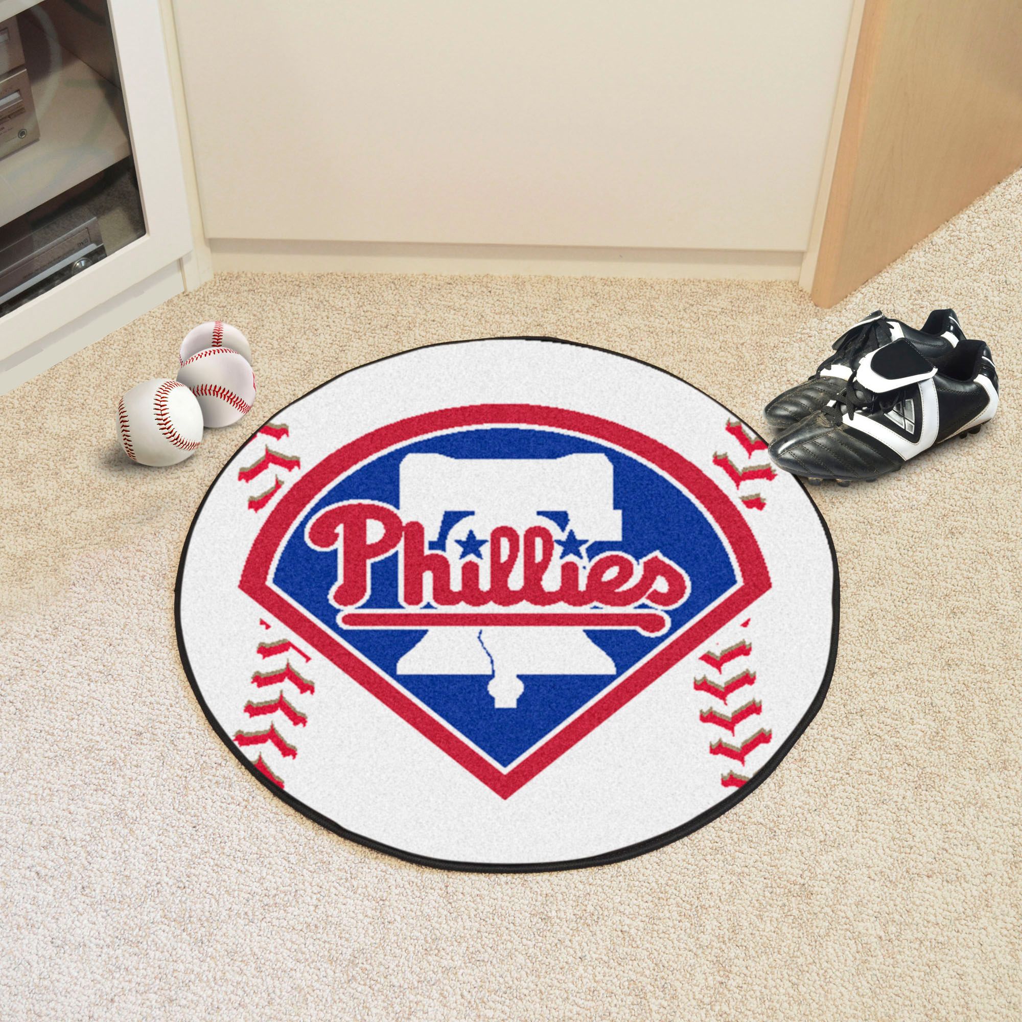Show your passion for the Philadelphia Phillies through your home décor with the FANMATS® Baseball Mat. This baseball-shaped area rug is made with 100% nylon and features a recycled non-skid vinyl backing. The FANMATS® Baseball Mat is proudly made in the USA and officially licensed by Major League Baseball®.