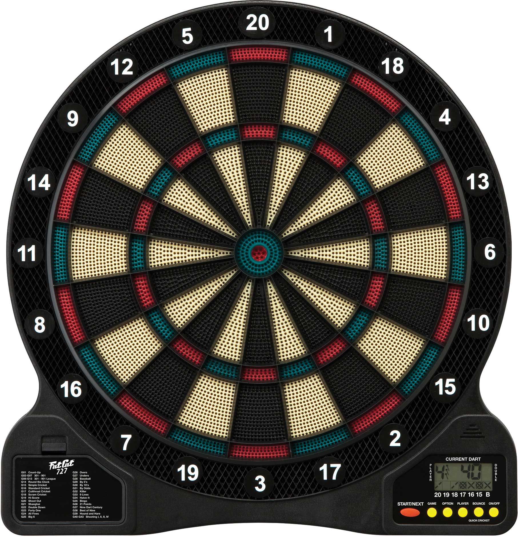 Let the Fat Cat® 727 Electronic Dartboard provide years of entertainment for your family. This affordable and fun dartboard plays 18 games, has 96 game options like cricket and baseball, and accommodates up to eight players. It has a 13” diameter target face with an LCD cricket display and tournament spider for easy viewing. The electronic dartboard includes two sets of darts.
