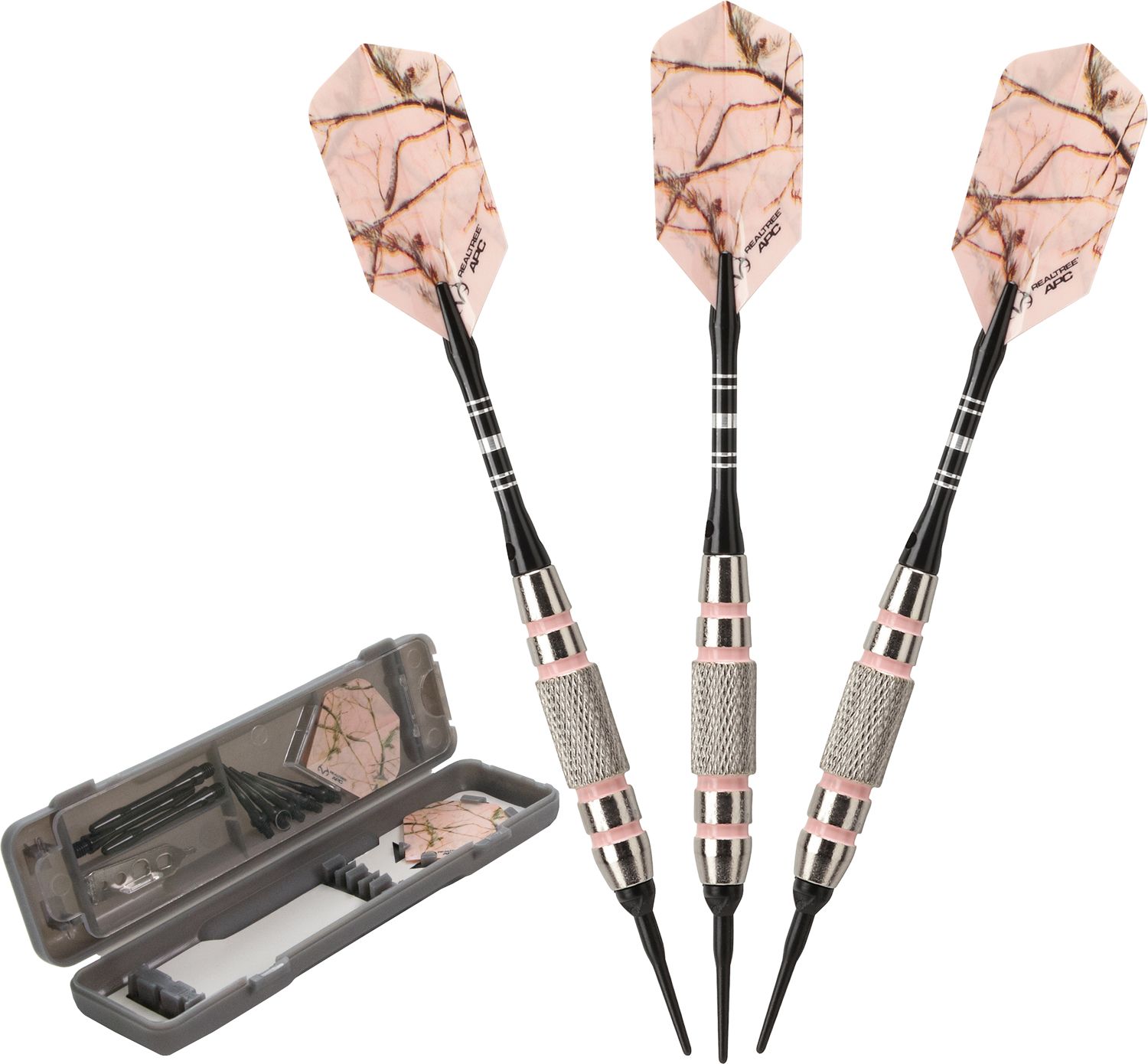 Combine lightweight durability with accuracy and performance when you wield the Fat Cat® Real Tree APC 16g Soft Tip Darts. The nickel silver plated barrels and nylon shafts allow these darts to effortlessly zip through the air, while the hand-painted pink grooves enhance your grip and accuracy. The set includes three darts, extra flights and shafts, tips, a dart wrench for quick adjustments and a slim case to keep your darts protected.