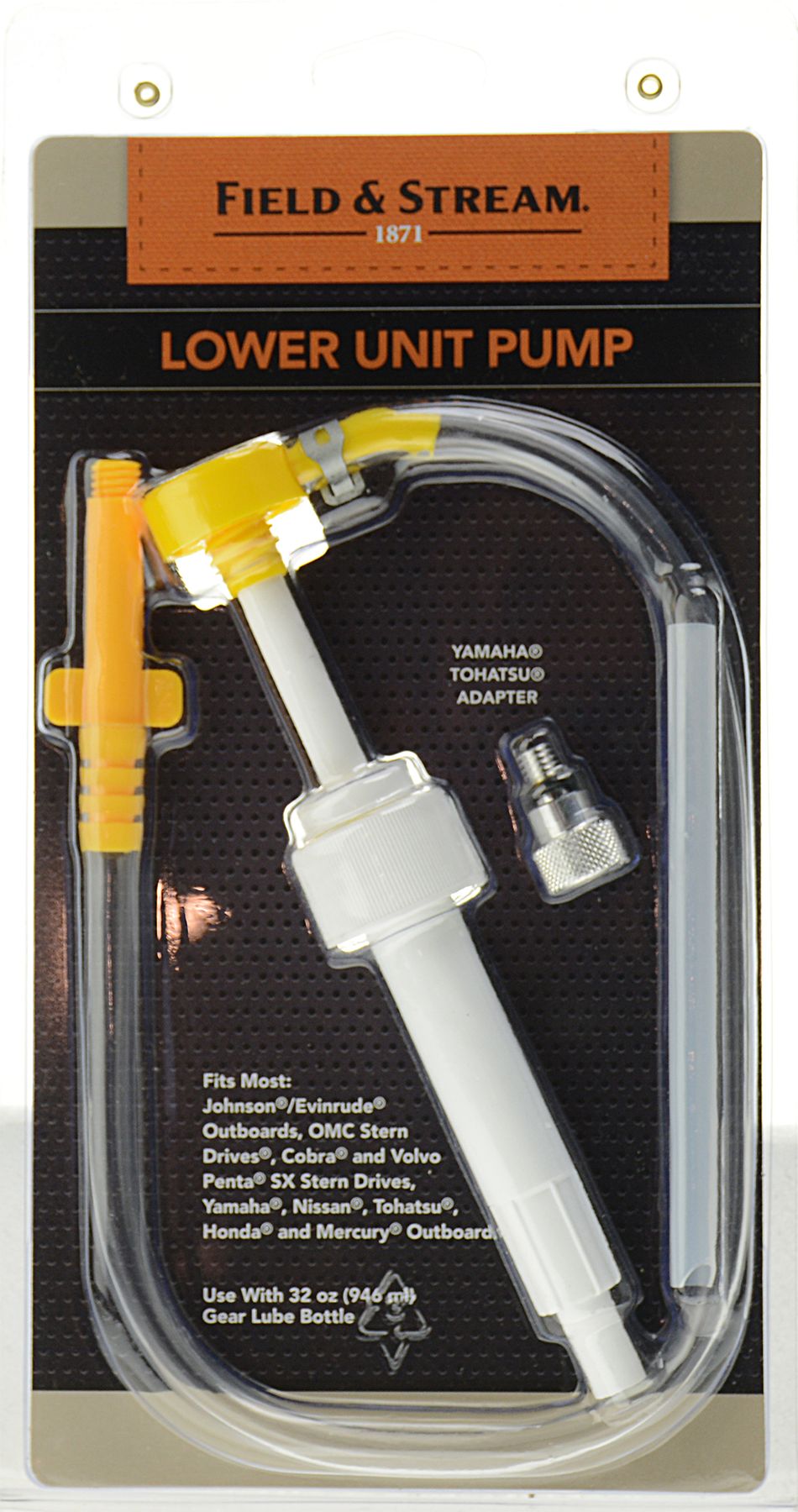 The Lower Unit Pump fits most Johnson®/Evinrude® Outboards, Cobra® and Volvo Penta® SX Stern Drives, Yamaha®, Nissan®, Tohatsu®, Honda®, and Mercury® outboards. In addition, it includes a Yamaha® Tohatsu® adapter. Use with Field & Stream® Lower Unit Pump with a 32 oz. gear lube bottle.