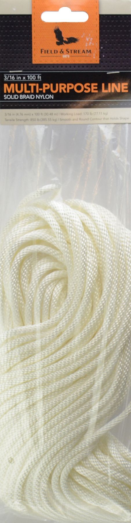 Strong and reliable, the Solid Braid Nylon Multi-Purpose Line is your go-to option when your own the water, whether you are tying down or tying on. This line is made from solid braid nylon and features a smooth and round contour that holds its shape. With a tensile strength of 850 lbs. and a working load of 170 lbs., the Field & Stream Solid Braid Nylon Multi-Purpose Line is a line that you can rely on.