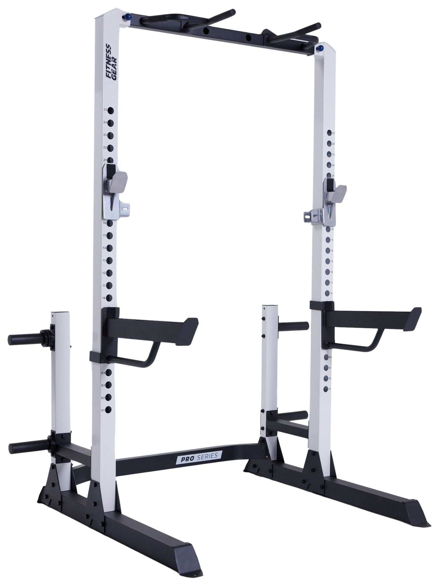 Constructed from heavy-duty, durable steel, the Fitness Gear Pro Half Rack offers 28 levels of adjustment for tailored workouts and includes 4 plate storage posts for convenient organization. The versatile pull-up/dip bar station provides multiple grips to target various muscle groups, while the extra-wide feet ensure unmatched stability during your exercises. Pair this rack with the Fitness Gear Pro Utility Bench for an even wider range of workout options.