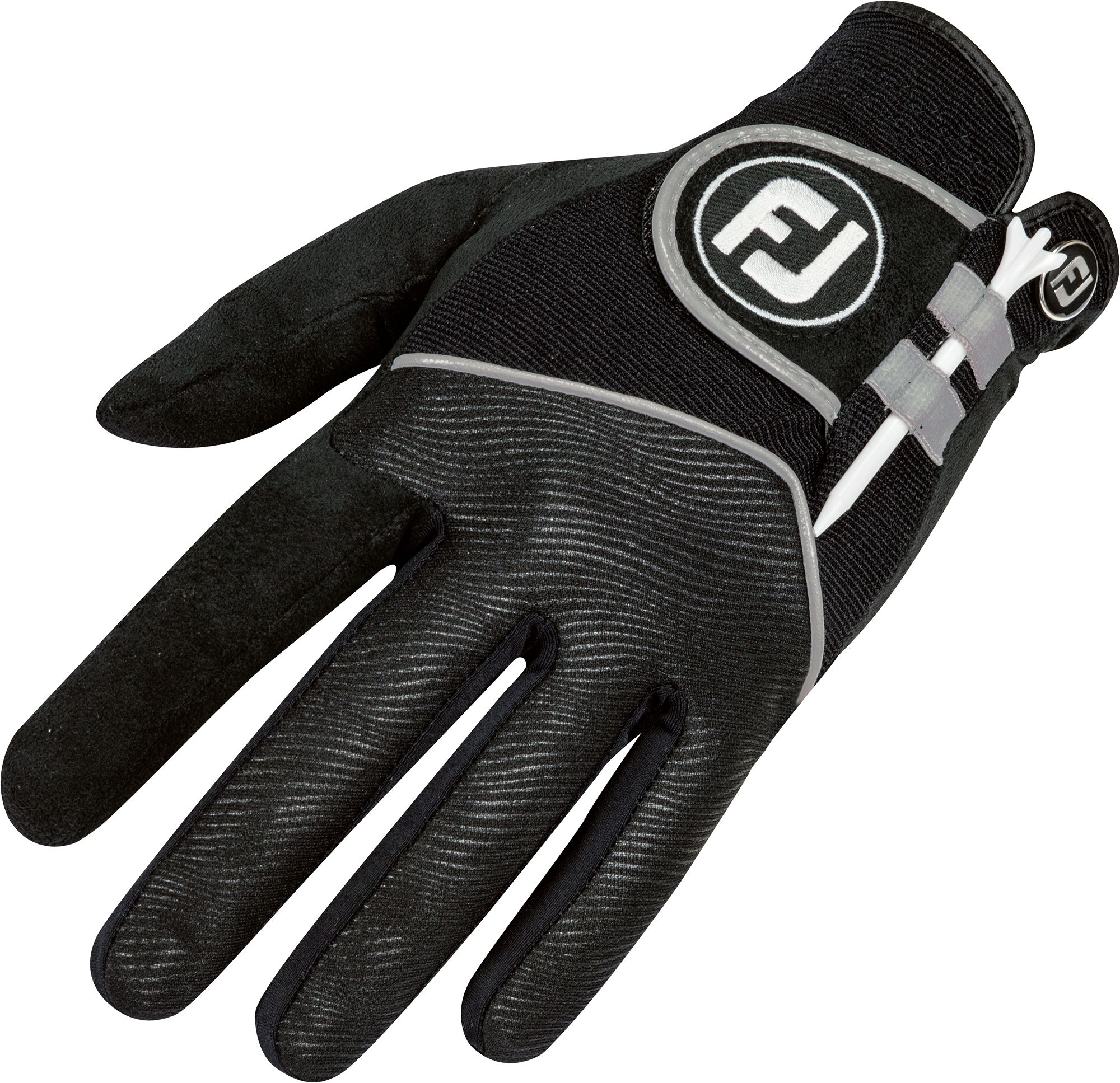The FootJoy® RainGrip® gloves offer must-have performance for wet weather conditions. The Suedemark™ microfiber palm delivers an unbeatable grip in wet or humid conditions, and the QuikDry® knit backhand provides breathability and dries quickly. Designed with an elastic band on the back, you can easily store a tee for quick and easy access.