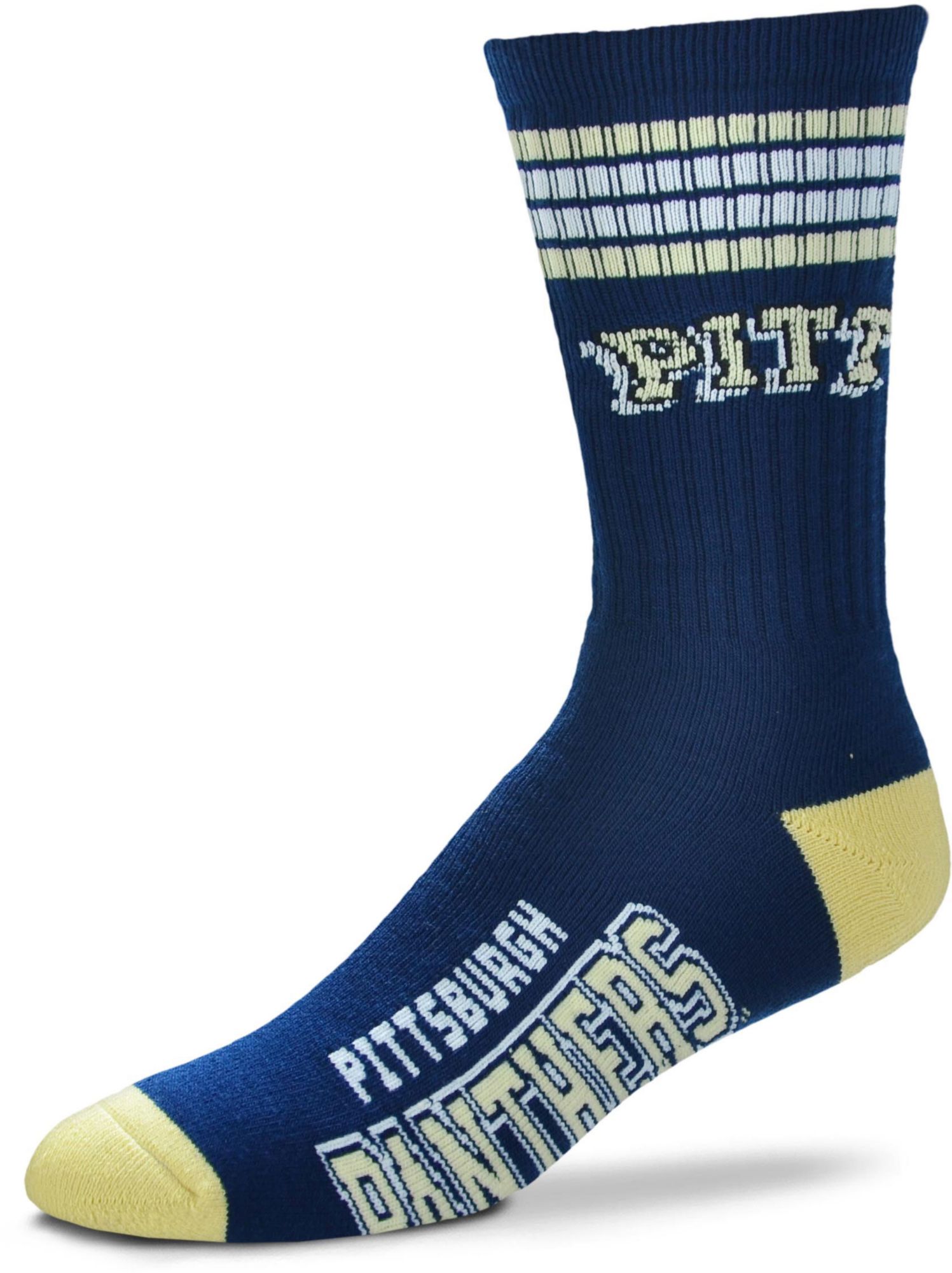 Stay stylish while celebrating your favorite team with the For Bare Feet® Pitt Panthers 4-Stripe Deuce Crew Socks.