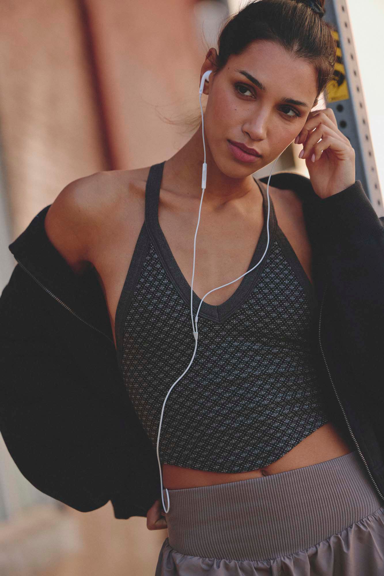 So essential, this cami is an easy layer featuring a soft and light fabrication with jacquard detailing that offers barely-there coverage, with a flattering V-neckline and racerback for effortless cool.