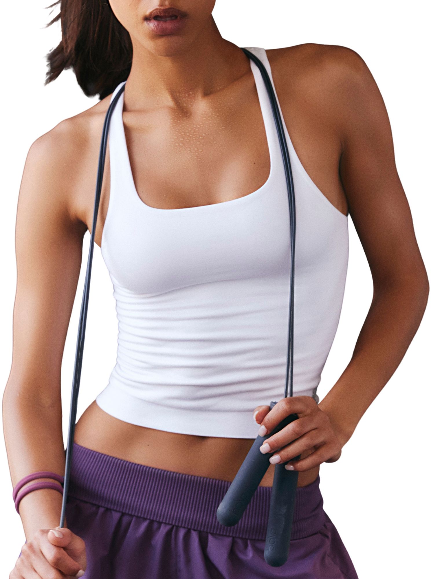 A workout essential, this soft tank is featured in a smooth knit fabrication and stretchy fit with a flattering square neckline and wide shoulder straps.