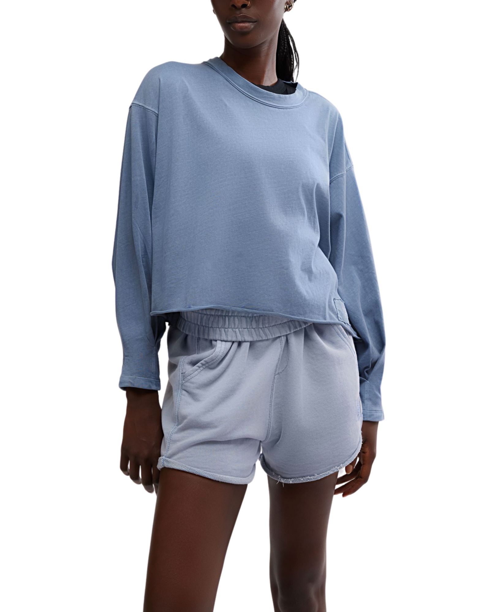 Warm up or cool down in this essential long-sleeve, featured in a boxy silhouette and slightly cropped fit with a classic crew neckline and raw-edge trim.