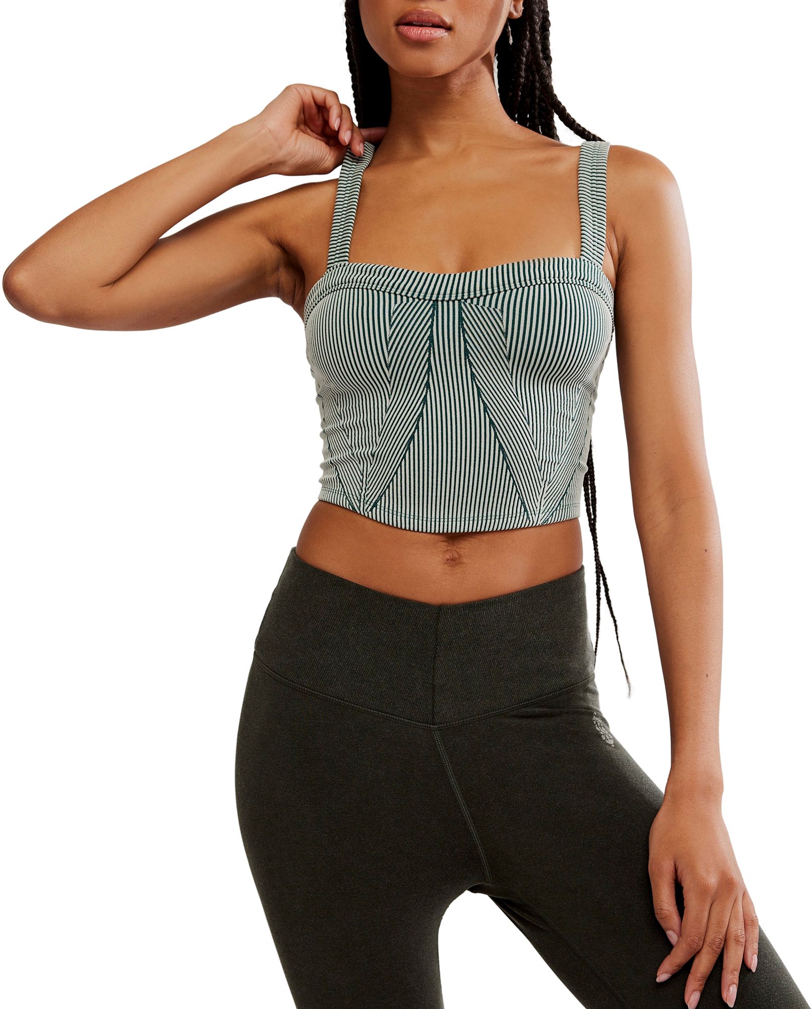 Fitted; cropped length with bodice-inspired stitching detail