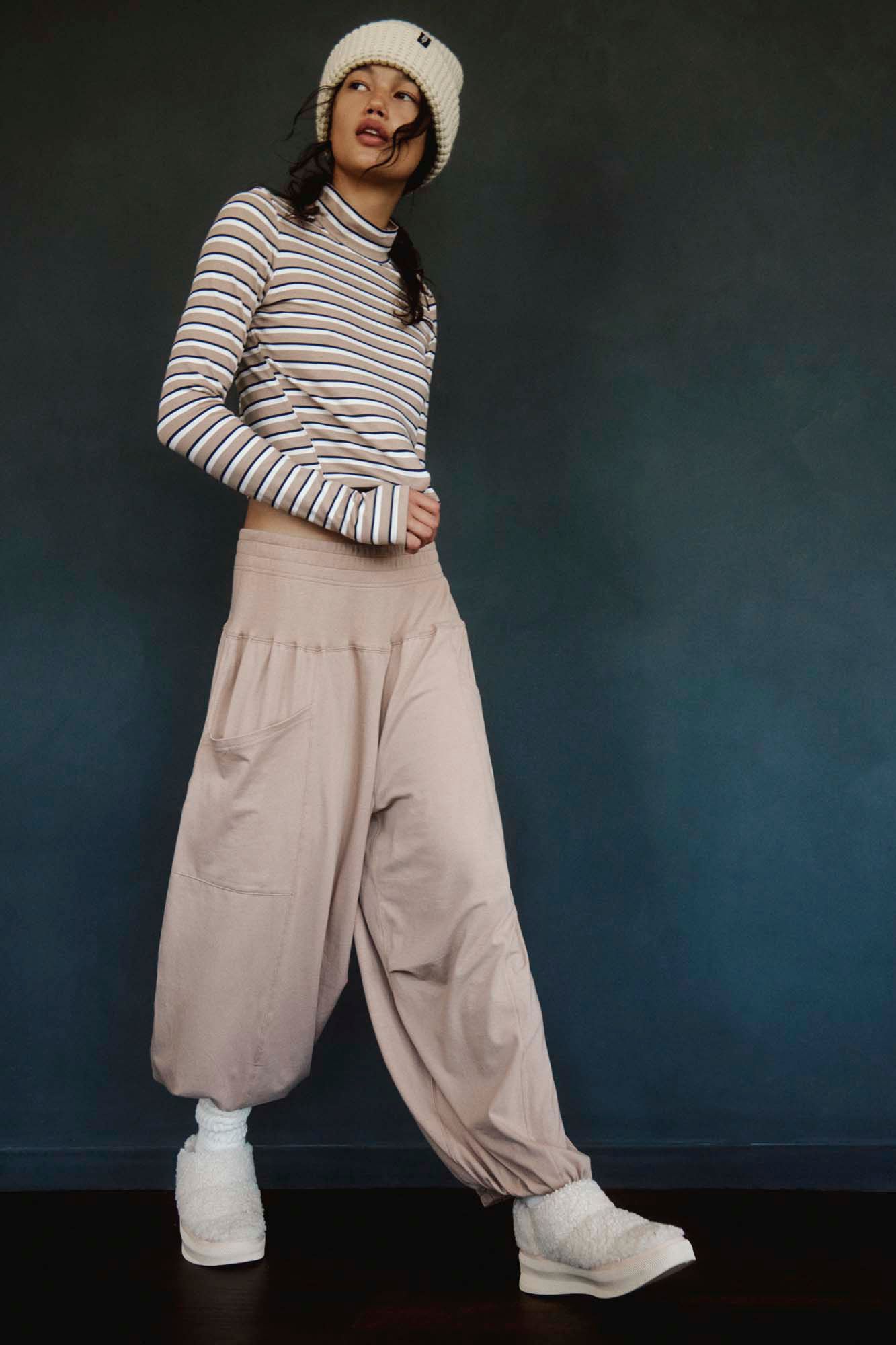 The shirt is tight and cropped. Pants like a balloon.