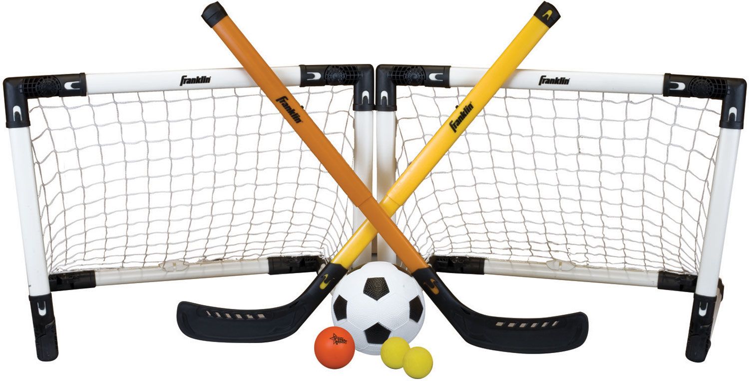 Designed for kids who love sports and are constantly in motion, the Franklin® 3-In-1 Indoor Sport Set provides all the action for hockey, soccer and knee hockey. This Franklin® set includes 2 Insta-Set® goals that are the perfect size for your little defenders. It comes with 1 mini soccer ball, 1 hockey ball, 2 mini foam hockey balls and 2 adjustable hockey sticks. It’s the perfect indoor combination set for your all-American athlete.