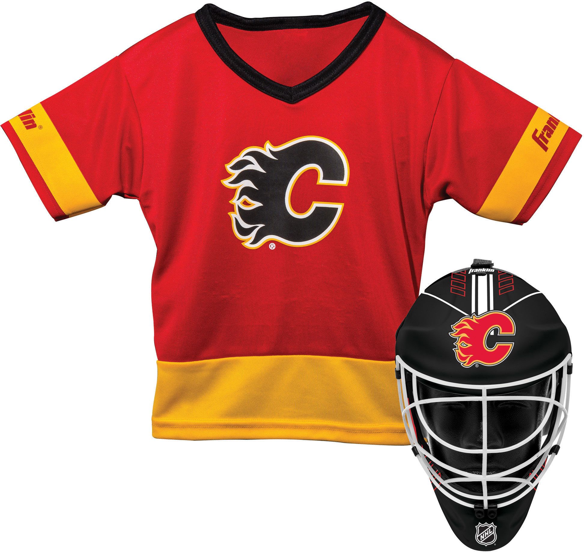 Make your kid feel like part of their favorite team with the Franklin® Calgary Flames Goalie Uniform Costume Set.