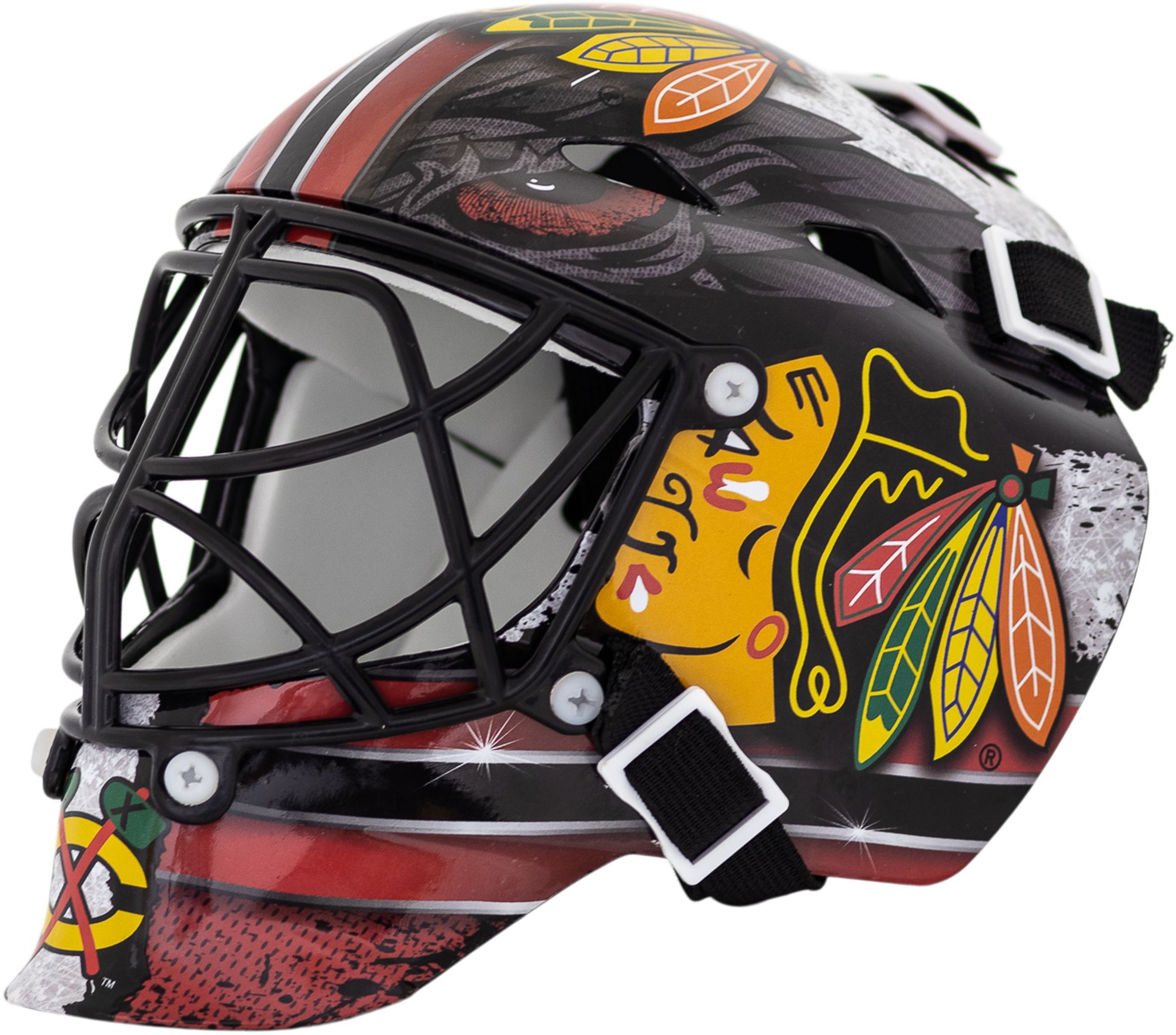Show your skill between the pipes with the Franklin® Chicago Blackhawks Mini Goalie Mask. Team colors and logos decorate this mini goalie mask, helping it look just like the one your favorite netminder wears on game day. The plastic vented shell, adjustable back plate and chrome-finished plastic cage create a look as authentic as the Blackhawks. Score a shutout for your favorite Western Conference team with the Franklin® mini goalie mask.