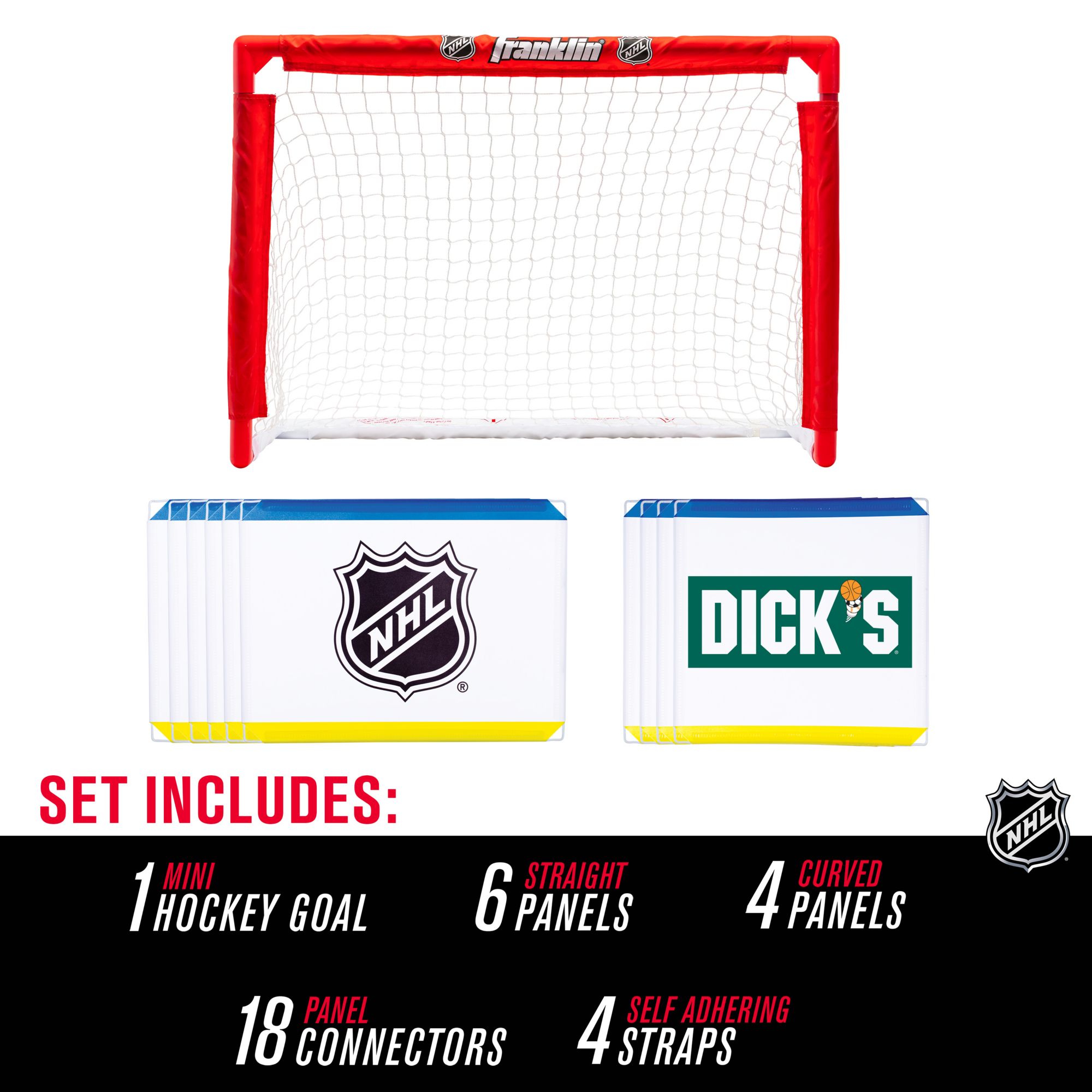 Order two sets and complete your rink! Bring the authentic hockey rink experience into your home today with Franklin Sports' Mini Hockey Rink Set! This set comes complete with 10 connectable side board panels to help construct a half rink right in your basement, playroom or wherever you play knee hockey. The fully assembled panels create a 9' wide x 7' long playing area, that you can customize to fit the shape and size of your room with ease. You can even get two sets to help complete the full rink for added fun! Plus, the sideboards go together and break down in no time with specifically designed snap-lock connections so you can spend more time in the game and less time setting up. This officially licensed NHL set is the perfect gift for any young hockey fan. So help your kids take their knee hockey game to the next level and grab your Franklin Sports Mini Hockey Rink Set today!